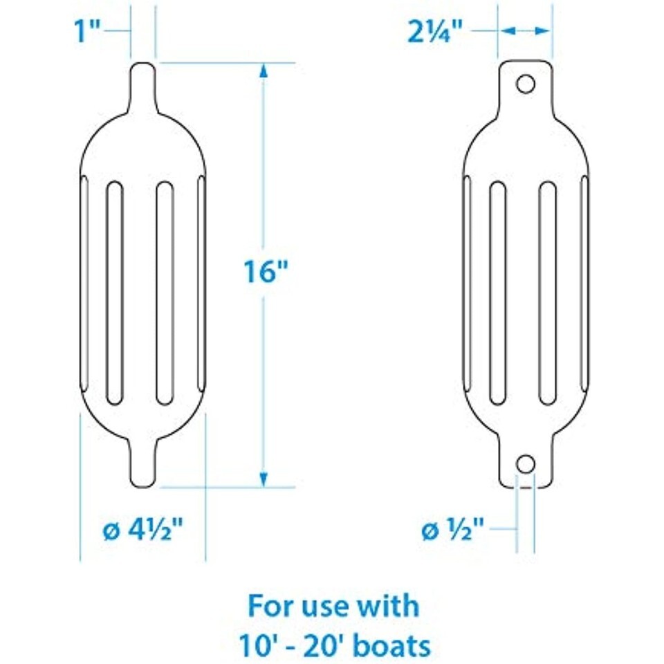 Acting as a cushion and preventing damage to your boat?s hull and topside, this rotomolded UV-resistant vinyl fender with sturdy ribs provides lasting durability. Inflation valve allows for adjustment to desired level of firmness, while twin eye design enables fender to hang vertically or horizontally for attachment to a deck cleat, dock or piling. Sold individually. Seachoice is committed to delivering quality marine accessories and OEM replacement parts to satisfy fishing, boating and watersports enthusiasts worldwide. Seachoice is run for and by boaters offering a wide-ranging product line while remaining affordable.