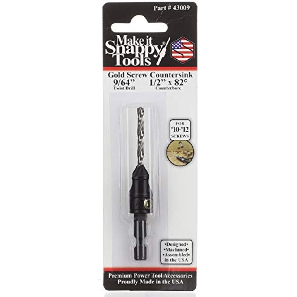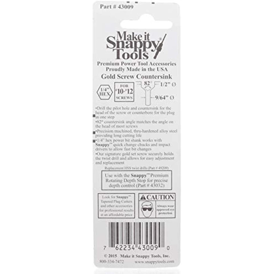 Drill the pilot hole and countersink or counterbore for screws in one easy step! The 82 countersink matches the angle on the head of most screws. Precision machined in the USA with tight tolerances. Made of thru-hardened alloy steel providing long cutting life. 1/4" hex power bit shank to fit in impacts and quick change chucks. Easily adjust or replace drill bit by loosening the hardened set screw that ensures a secure hold on the pilot drill. Utilize the Snappy Premium Roatating Depth Stop for precise depth control (Part # 43032) (Sold Seperately)