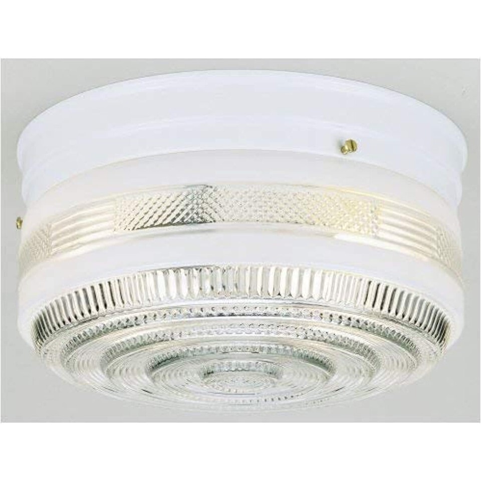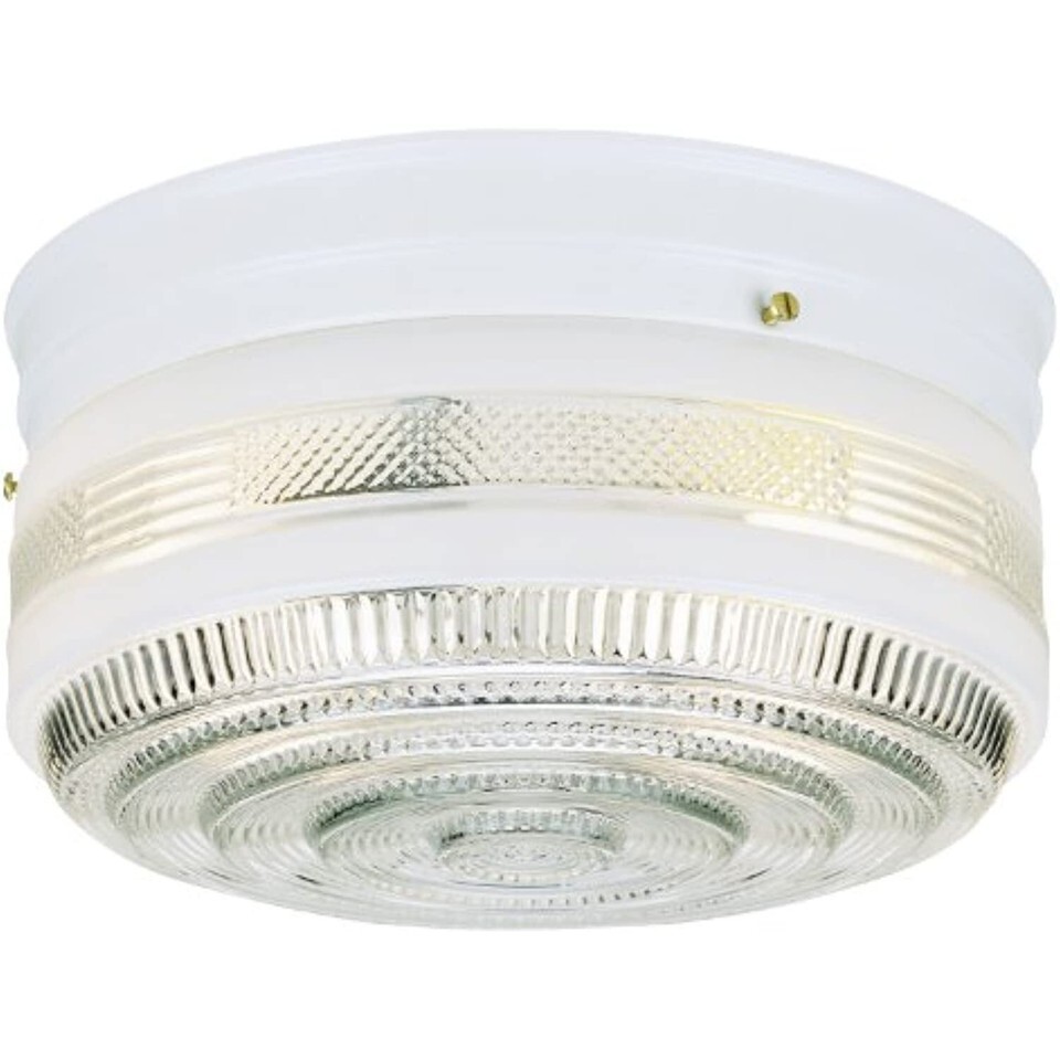 With a practical, compact cylindrical form, this Westinghouse Two-Light Flush-Mount Interior Ceiling Fixture adds a stylized, functional touch to any room. The banded base features a smooth white finish that matches white glass bands further down the fixture. Distinctive ribbed clear glass and slender stacked concentric circles on the bottom add texture to the fixture for a nice contrast. The versatile flush-mount design makes this fixture good for low ceilings as well as high ones in kitchens, closets, and laundry rooms. Wherever you mount it, you will enjoy the fixture's bright light and subtly patterned design. The fixture is 5-1/4 inches high by 10-3/4 inches in diameter. It uses two medium-base light bulbs, 75-watt maximum (not included). This Westinghouse interior ceiling fixture is Underwriters Laboratories listed for safety. It is backed by a five-year limited manufacturer's warranty against defects in materials and workmanship. Product reference number 66238.