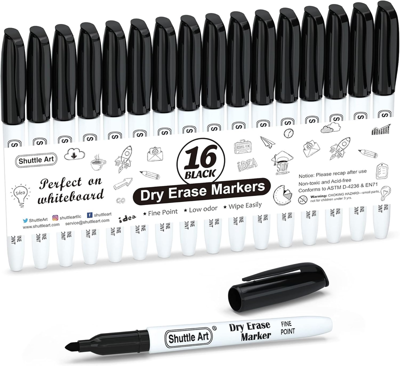 16 BLACK FINE TIP: Shuttle Art 16 pack black dry erase markers with fine tip,easily to read markers in the classroom or council chamber. More dry erase markers with affordable price!