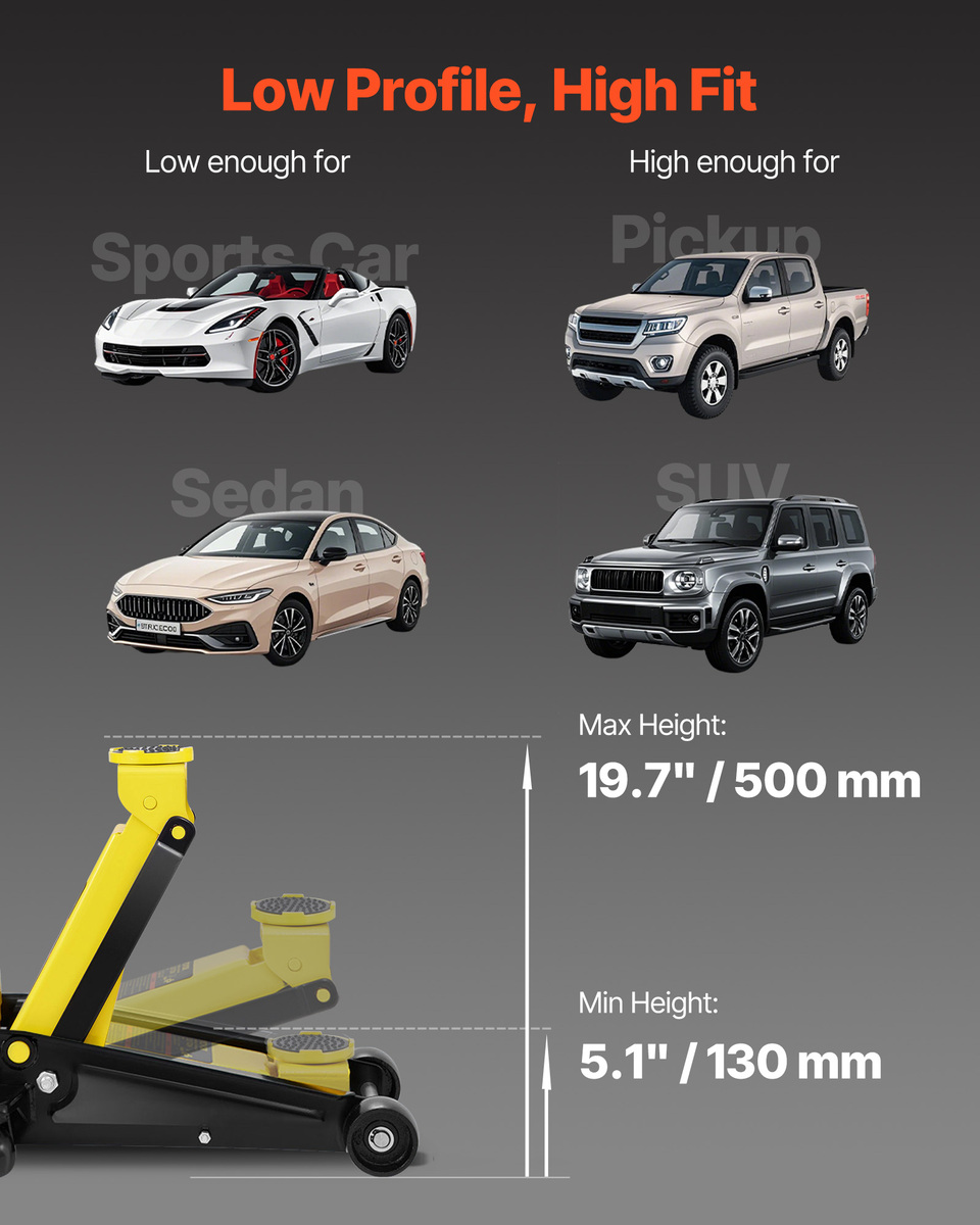 For All Your Lifting Needs: Min. Height: 5.12"/130 mm. Max. Height:19.7"/500 mm. The wide lifting range meets your lifting needs of family cars, trucks, SUVs, etc. And a single piston quick hydraulic pump allows you to pump the jack to the desired height easily.