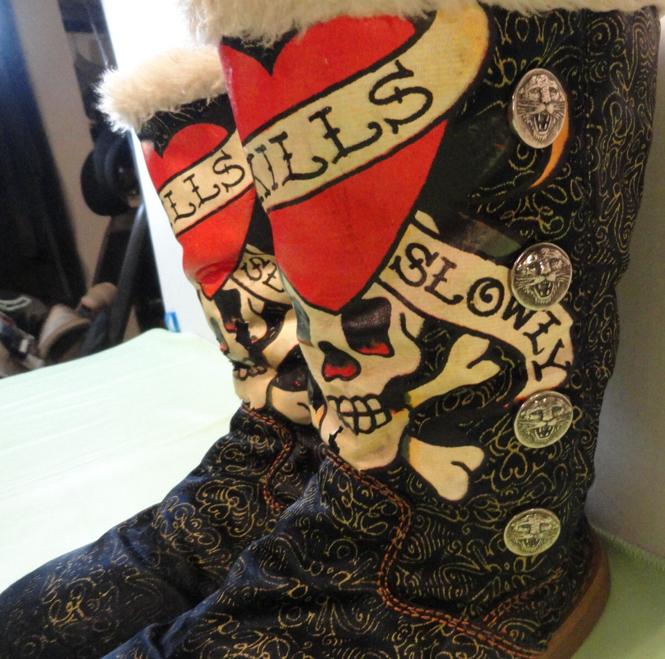 Rare Collectible Ed Hardy BLUE GOLD BOOTS HEART SKULL CROSSBONES WOMENS SIZE 6
