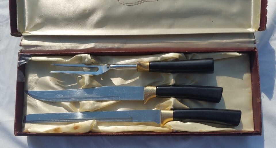 THIS WAS MY GRANDMOTHERS SET I FOUND IN HER STORAGE / THIS SET IS OLD AND VINTAGE , THIS IS THE FOREVER SHARP STAINLESS STEEL 3 PIECE CUTLERY SET / YOU GET 2 KNIVES AND 1 SERVING FORK , THE STAINLESS STEEL ITSELF LOOKS AMAZING, AS YOU CAN SEE THE HANDLES ARE NOT BAD, THERES SOME TARNISH HERE AND THERE, THE BOX IS ABSOLUTELY AGED, YOU CAN TELL ITS BEEN AWHILE ( OVER 60 YEARS OLD ) , PLEASE LOOK AT MY PICTURES, THIS IS A GREAT GIFT IDEA FOR THAT PERSON WHO CAN NO LONGER BUY THESE ANYMORE.