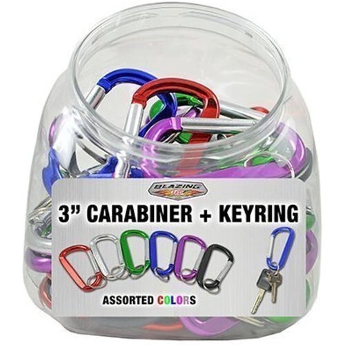 Carabineer with key ring display includes one 1' key ring and 48 pieces loaded in fishbowl. Available in 6 assorted, fun colors; red, silver, green, blue, purple and black. Product measure 3".