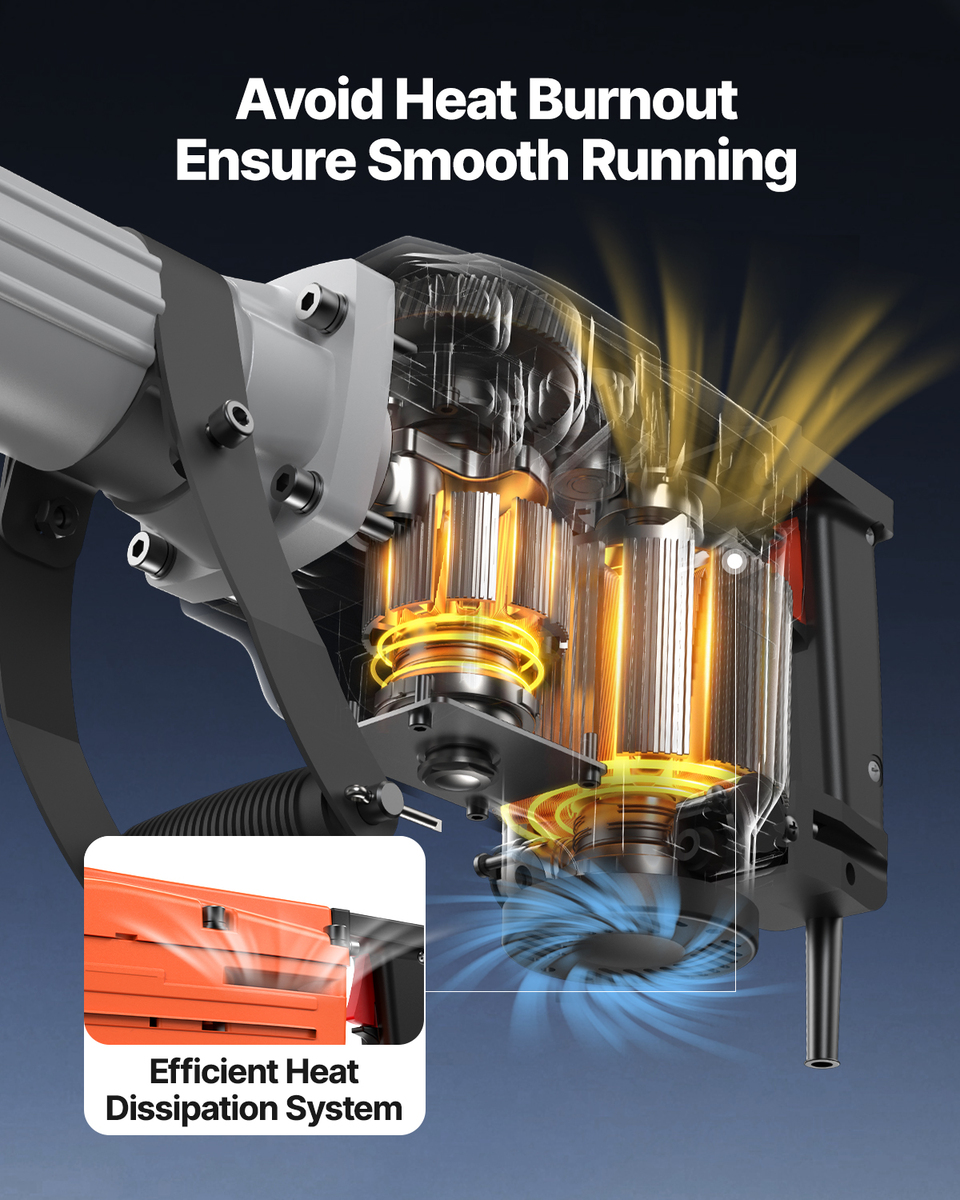 Stays Cool During Intense Work: The efficient cooling system effectively cools the motor to improve the concrete breaker's life. The engine will be at low temperatures even after a long working time.