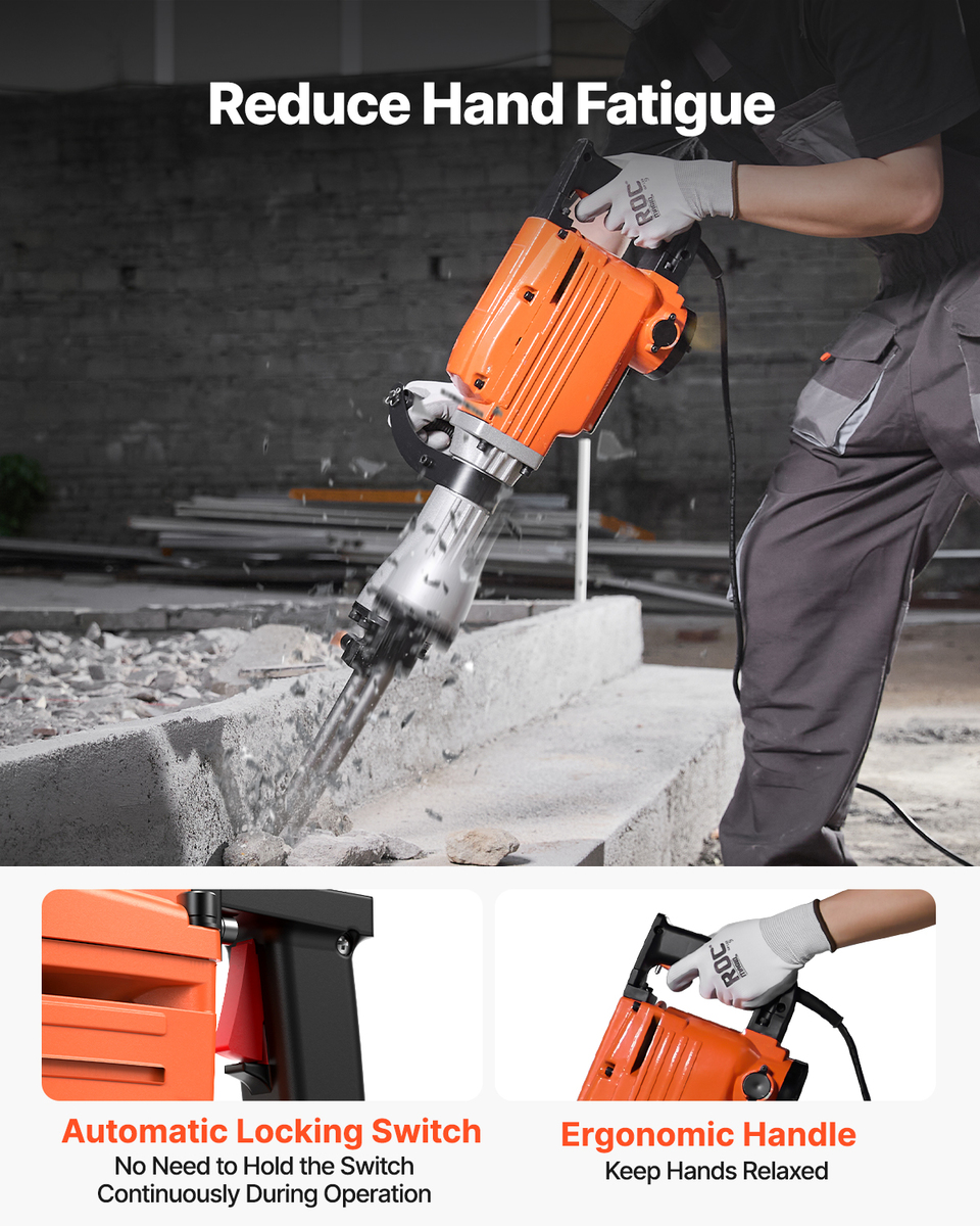 Designed To Go Above And Beyond: The 360rotary handle reduces fatigue during prolonged work. It provides accuracy and precision in some relatively narrow places. The demolition hammer is also equipped with a suitcase for carrying conveniently. The locking button can automatically maintain operation, saving effort.