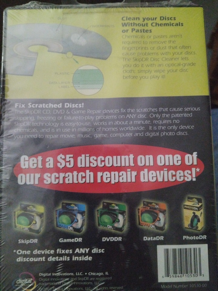 The Skipdr Disc Cleaner is a cleaning cloth specifically designed for use in cleaning and maintaining audio and video media. Manufactured in 2003 by the brand SkipDr, this cleaning cloth is essential for ensuring optimal performance and longevity of your media collection. Perfect for keeping your discs spotless and free from dirt and grime, the Skipdr Disc Cleaner is a reliable and effective tool for any home audio and video enthusiast.