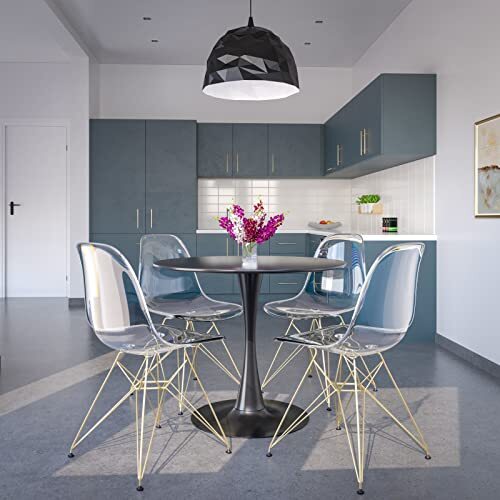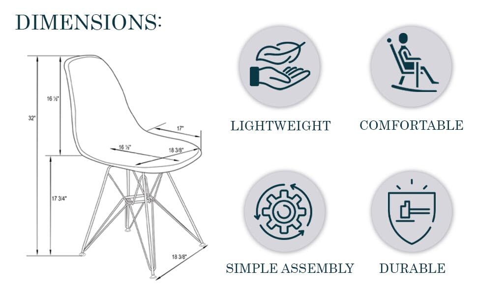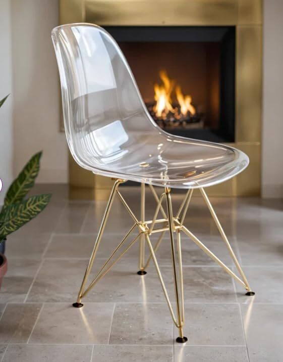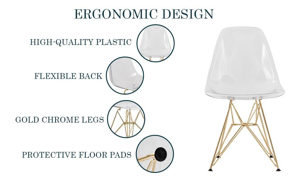 The chair has a gently curved backrest and a subtle dip where the back and seat meet. This ergonomic shape provides firm, structured support that follows the natural curve of the spine. The design emphasizes stability and promotes a comfortable seating experience suitable for extended periods. The chair has a molded shell seat made from high-quality clear plastic, offering a clean, modern look that suits various spaces. The single-piece construction connects the back and seat into one solid form, enhancing structural integrity and creating a seamless, unified appearance. The chair features a sturdy chrome Eiffel-style base with an X-shaped support structure, crafted from durable, corrosion-resistant chrome material. This high-quality chrome ensures long-lasting stability and resilience, maintaining its structural integrity over time. The X-shaped design reinforces the frame, adding an extra layer of strength to support daily use. Each leg joint includes rubber plates that absorb impact, strengthening the chair’s stability and creating a secure, balanced foundation. Protective rubber pads on the bottoms of each leg prevent slipping and shield floors from scratches, making this design practical and safe for various surfaces. The chair’s lightweight construction makes it easy to lift and move, allowing for effortless repositioning as needed. Despite its light weight, the chair remains strong and durable, providing reliable seating in any setting. Ideal for both dining and accent seating, this chair fits effortlessly into any decor style, whether in homes, offices, or commercial spaces. Its modern design and functional features make it a standout piece for diverse environments. This chair requires only a few simple steps for assembly, with each part fitting securely for a stable, well-constructed finish. Clear instructions guide the process, making the setup straightforward and efficient.