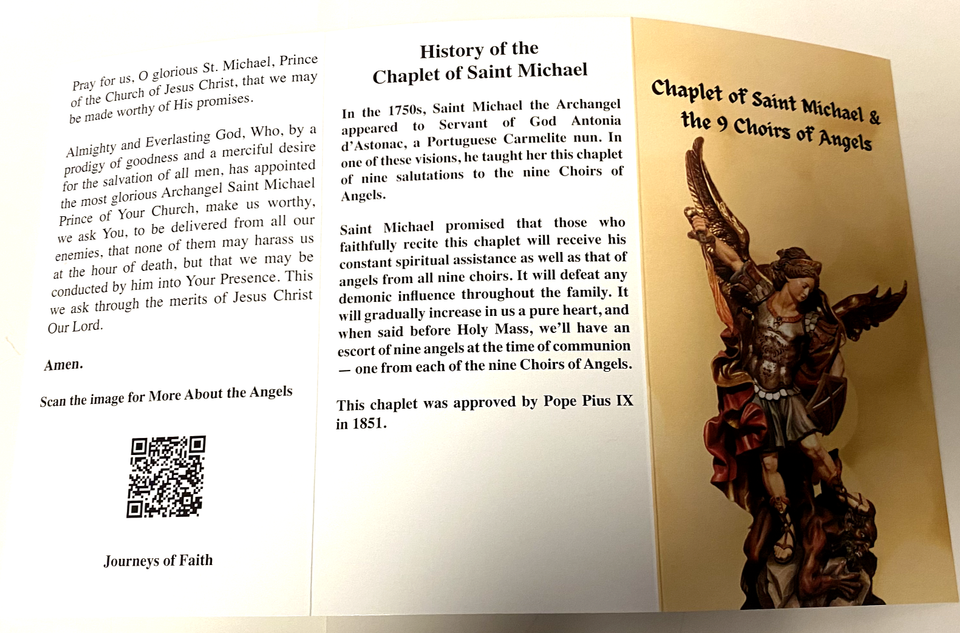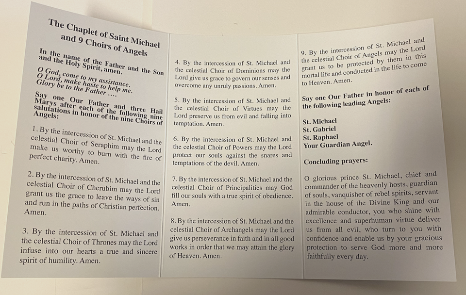 You are purchasing a Chaplet of Saint Michael the Archangel 9 Choir of Angels tri-fold card.