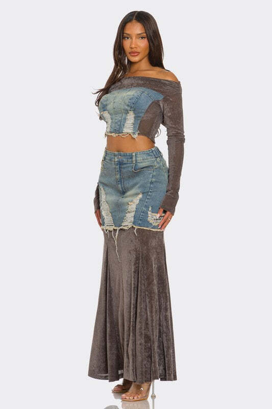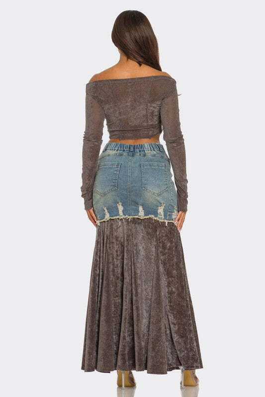 Make a bold statement with this two-piece ensemble featuring a captivating blend of textures and styles. The set includes an off-shoulder velvet long-sleeve crop top with a structured denim-inspired bustier overlay. The top is paired with a high-waisted distressed denim mini-skirt layered over a flowing velvet maxi skirt, creating a unique combination of edgy and elegant.