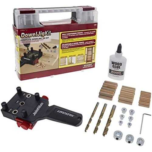 Milescraft 1333 Dowel Jig Kit - Handheld Dowel Jig with 3 Metal Bushing Sizes (1/4in, 5/16in, 3/8in) and Self-Centering Pins, 3 Brad Point Drill Bits, 3 Depth Stops, 6 Dowel Centers, and Wood Glue