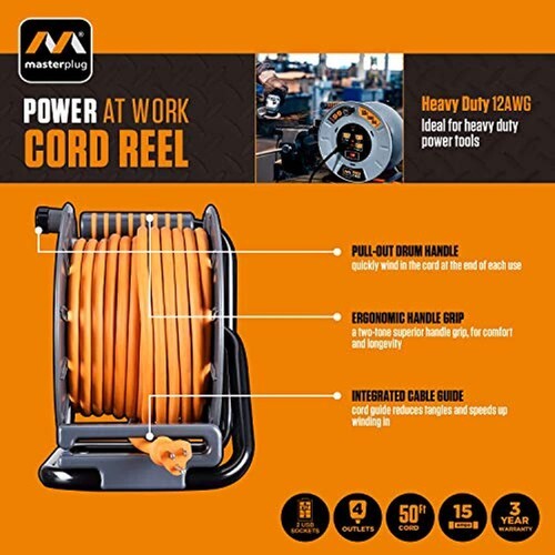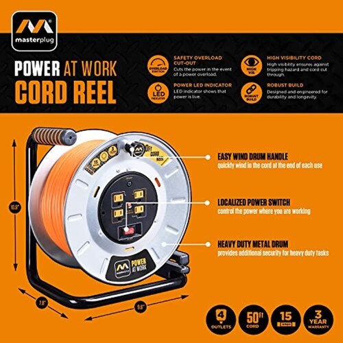 Masterplug Power At Work Metal Steel Drum with Four Powered Outlets, Open Cord Reel with Winding Handle, Safety Overload Circuit Breaker and Power Switch, 50 Feet 12AWG, High Visibility Cord, Orange