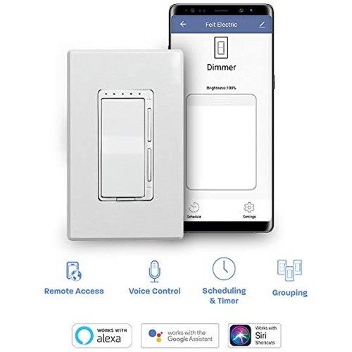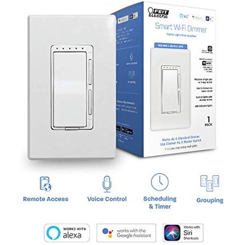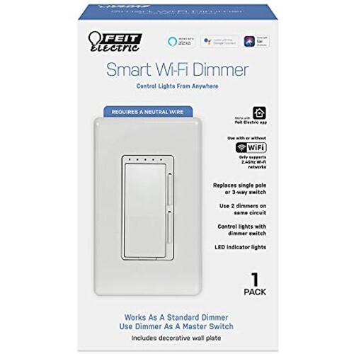 Make your home into a smart home with the Feit Electric Smart Wi-Fi Dimmer. Feit Electric Smart Dimmer Light Switch works as smart or standard dimmer. A 2. 4 GHz Wi-Fi network connection is required to setup as smart dimmer. Set schedules and adjust the brightness of your home without touching a single switch - simply use the intuitive mobile app or give a voice command to your Alexa or Google Assistant device. This dimmer works with all dimmable incandescent, halogen, CFL or LED light bulbs. Group up to 20 smart dimmers via Wi-Fi, even if they're on different circuits. Create a master dimmer to control the actions of others. Each dimmer includes a screwless decorative wall plate with an LED indicator light. Installation hardware is included. Licensed electrician is recommended for installation. It is easily setup and connect up to 20 smart dimmers remotely.