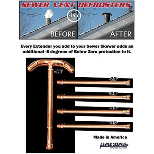 The Patented Sewer Skewer XL comes with 2x 15" screw on extension pipes. No tools needed to add on these extensions. The Sewer Skewer XL is ideal for problematic sewer vents. The total length of the Sewer Skewer XL is approximately 47 inches long and extends down 45? into vent pipe. The Sewer Skewer keeps sewer vents clear of snow and Ice all winter long and is rated for -25 degrees below zero. Fits any size pipe and is easy to install, simply drop it in the pipe vent and it begins to work. Provides peace of mind that your sewer vents will be kept clear during even the coldest winter nights so you will not get backed up sewer gas in your home from a plugged up Sewer vent. It is recommended customers replace their Sewer Skewers every 3 years for maximum frost-free performance. This is due to all the residue that can accumulate inside the Sewer Skewer and plug it up, which will drastically lose its ability to transfer heat to the top of the vent. Sewer gas contains methane and many other particles that will stick to the inside of the chamber and plug the pipes. WARNING: Sewer Gas Contains methane and is highly corrosive. Hence, you must check your Sewer Skewer annually for any signs of deterioration. Replace as necessary to continue optimum performance as a Sewer Vent Defroster.