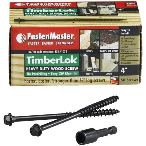Product Description Fasten master, 50 pack, 4 inch timberlok screw, no pre-drilling, timberlok drives right through pressure treated wood reduces labor time with quick safe 1 step installation. boxed. From the Manufacturer Save time, money, and labor costs. TimberLOK's sharp point and aggressive threads penetrate the densest woods without predrilling and provide stronger shear values than 3/8 inch galvanized lag screws. TimberLOK's unique countersinking head design is perfect for your next wood-to-wood project, whether it be deck framing, fencing, or any post to beam connections. It?s also perfect for replacing galvanized spikes in raised flower beds, landscaping, or retaining walls. No need to predrill and sledge a spike. TimberLOK just zips right in. Each pack size contains a free 5/6 inch driver bit. TimberLOK fasteners are American made.