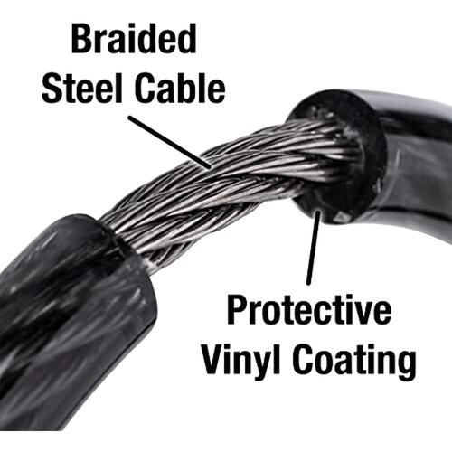 Bike lock is made with braided steel for flexibility, and includes a protective vinyl coating that helps prevent scratching