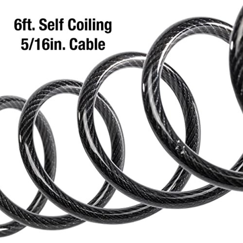 Bike lock cable is 6 ft. (1.8 m) long and 5/16 in. (8 mm) wide in diameter