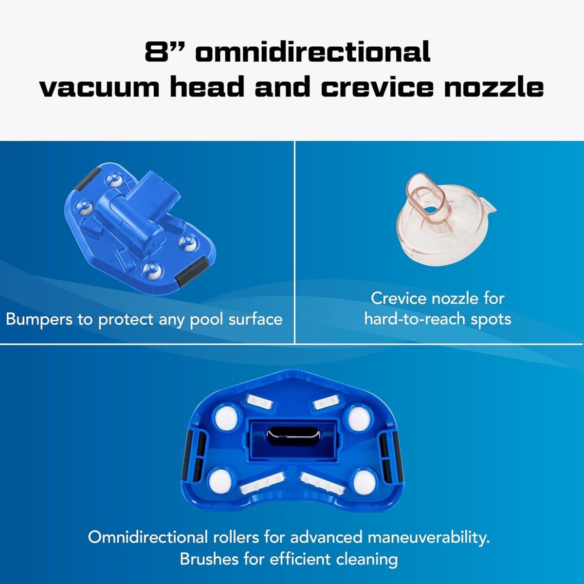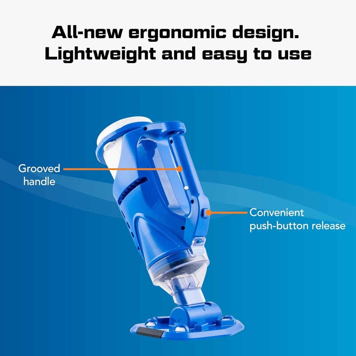 Pool pole not included. The Catfish Gen 2 cordless pool and hot tub vacuum delivers trusted Water Tech performance with an enhanced design for deeper cleaning. Ideal for spas, hot tubs, and small pools, it tackles steps, corners, and hard-to-reach spots. The Omni-Directional head moves in all directions, while the larger debris chamber and improved filtration capture more dirt. Runs up to 45 minutes per charge with no hoses needed and attaches to any standard telescopic pool pole.
