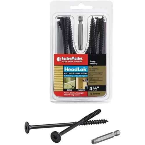 Product Description FastenMaster FMHLGM412-12 HeadLOK Heavy-Duty Flathead Fastener, 4-1/2 Inches, 12-Count From the Manufacturer Save time, money, and labor costs. HeadLOK eliminates the need to predrill and hand-ratchet in 3/8 inch galvanized lag screws in wood-to-wood projects. HeadLOK's aggressive threading and sharp gimlet point allows it to zip right into wood or OSB without predrilling. Plus, the wafer head eliminates the need for washers and offers increased pull through strength. Perfect for deck framing, stair stringers, fencing, cabinets, and more! Sizes are perfect for virtually any dimensional wood-to-wood project. HeadLOK fasteners are American made.