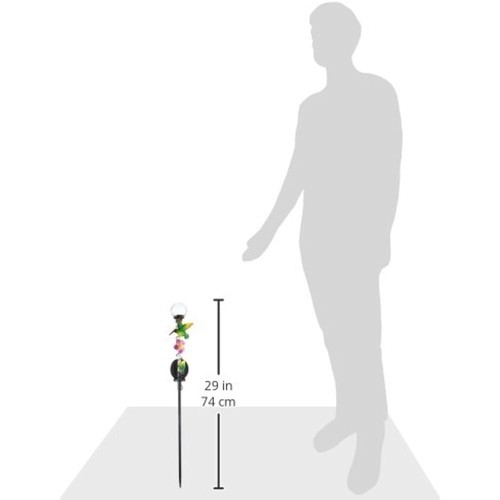 Four seasons courtyard, solar stake light, motion lights on the stake a color changing ball on the top, metal decor with a hummingbird wrapped around the stake to add color during the day.