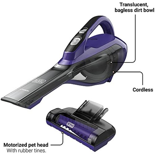 Loving your pet means cleaning up after them, too. The BLACK+DECKER dustbuster AdvancedClean cordless pet handheld vacuum is a pro at quick pickups. Powered by a lithium ion battery that supplies strong suction and a long runtime, this portable hand vacuum is up for a number of tasks. It?s equipped with a motorized pet head attachment that has anti-tangle rubber tines for pet hair removal. A pull-out crevice tool lets you access difficult-to-reach areas and cramped spaces, while the push-in brush is ideal for dusting and cleaning furniture upholstery. Plus, the bagless, no-mess dirt bowl is translucent, so you?ll always know when it needs to be emptied out. Both the bowl and filter are washable in the sink, too. When you've finished the job, store and recharge the hand vacuum on the wall mount. An indicator light will notify you when it is fully charged.
