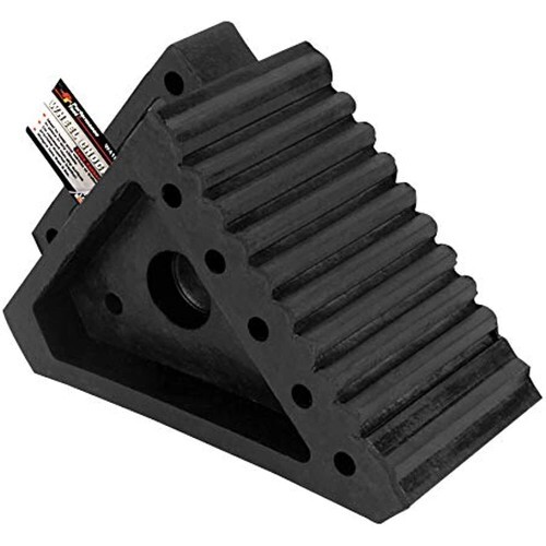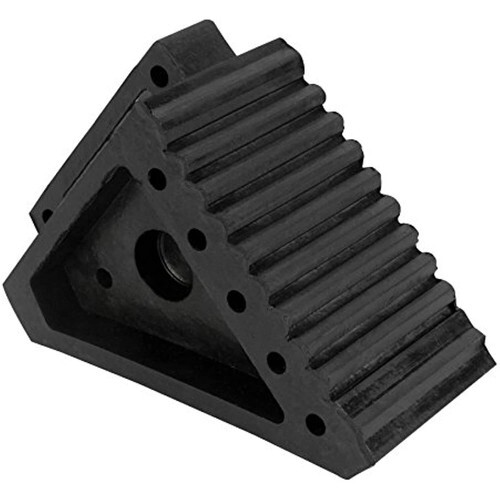 Ideal to keep your vehicle or trailer in place in any climate. All weather construction with rubber traction pad. Oil resistant non-slip surface provides superior traction. Weighs less than 5 pounds. Specs: 45 slope angle, Wheel contact area: 7-1/2-inch Length x 3-57/64-inch Width, Base size: 7-3/4-inch x 3-31/32-inch, Chock height: 5-7/8-inch, Handle: 5-5/8-inch Length x 1-5/16-inch Width x 1-inch Height.