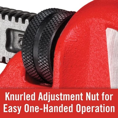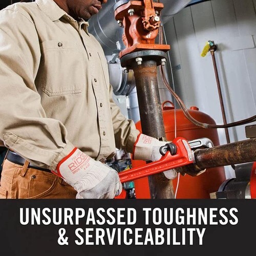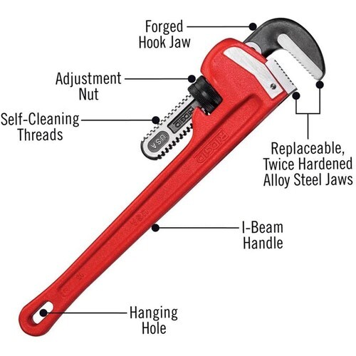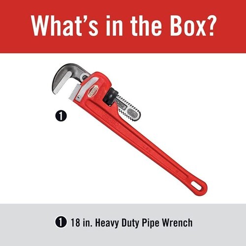 Product Description Complies with federal specifications GGG-W65IE, Type ll, Class A.Ready to tackle tough jobs, the RIDGID 31025 Model 18 Heavy-Duty Straight 18-Inch Pipe Wrench is a plumbing wrench that features sturdy ductile-iron housing and an I-beam handle for long-lasting durability. It has a quickly adjustable full-floating forged hook jaw featuring self-cleaning threads and easily replaceable spring assembly, hook jaw and heel jaw.The plumbing wrench comes in a convenient red color that is easy to find in a crowded toolbox. A versatile plumbing tool, this RIDGID 18 inch pipe wrench is ideal for pipe diameters of 1 inch to 2 inch with a capacity of up to 2-1/2 inches, and is suitable for all types of pipe work.Since 1923, RIDGID has remained the symbol of certainty to dedicated professionals of the expert trades. Every tool that bears the RIDGID brand is engineered to the same high standards of quality, strength and endurance, as was that first heavy-duty pipe wrench more than 80 years ago. From the Manufacturer Since 1923, Ridgid has remained the symbol of certainty to dedicated professionals of the expert trades. Every tool that bears the Ridgid brand is engineered to the same high standards of quality, strength, and endurance, as was that first heavy-duty pipe wrench more than 80 years ago. Ridgid covers its products with a lifetime warranty against defects in material or workmanship for the life of the tool. The Ridgid 31025 is a heavy-duty straight pipe wrench with a capacity of 2-1/2-Inch. This wrench features sturdy, cast-iron housing and I-beam handle with full floating forged hook jaw, featuring self-cleaning threads with replaceable hook and heel jaws. This wrench complies with federal specifications GGG-N65IE, type ll, class A. The nominal size is 18.