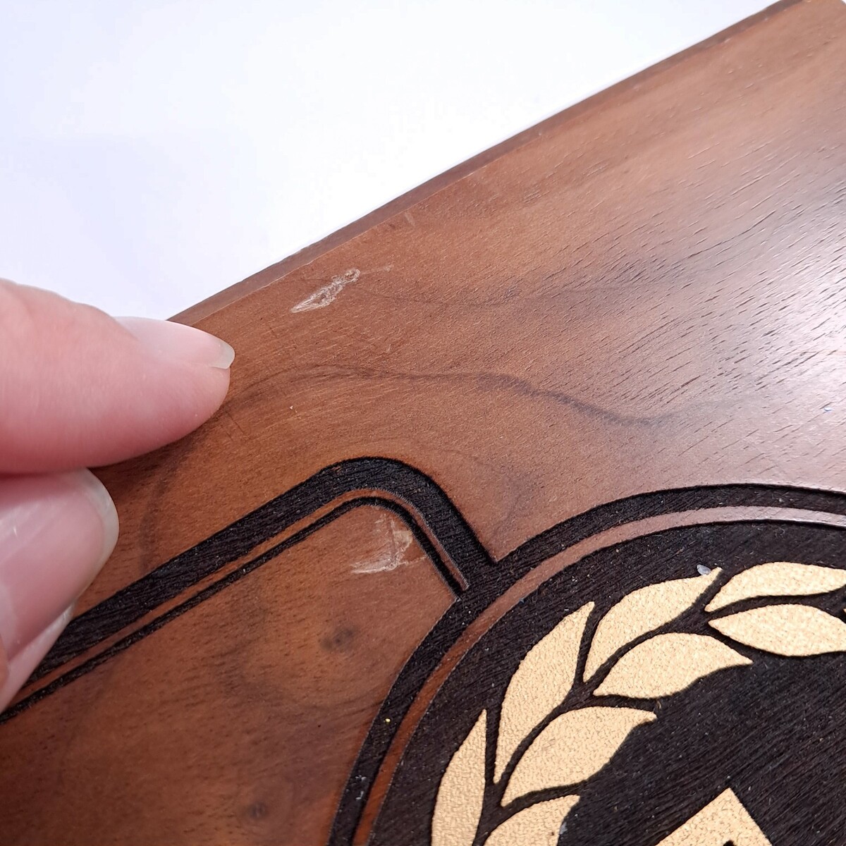 Wood plaque, most likely from the 1970s-1980s. Some wear/scuffs/scratches as shown. Can be hung on the wall. See pics.