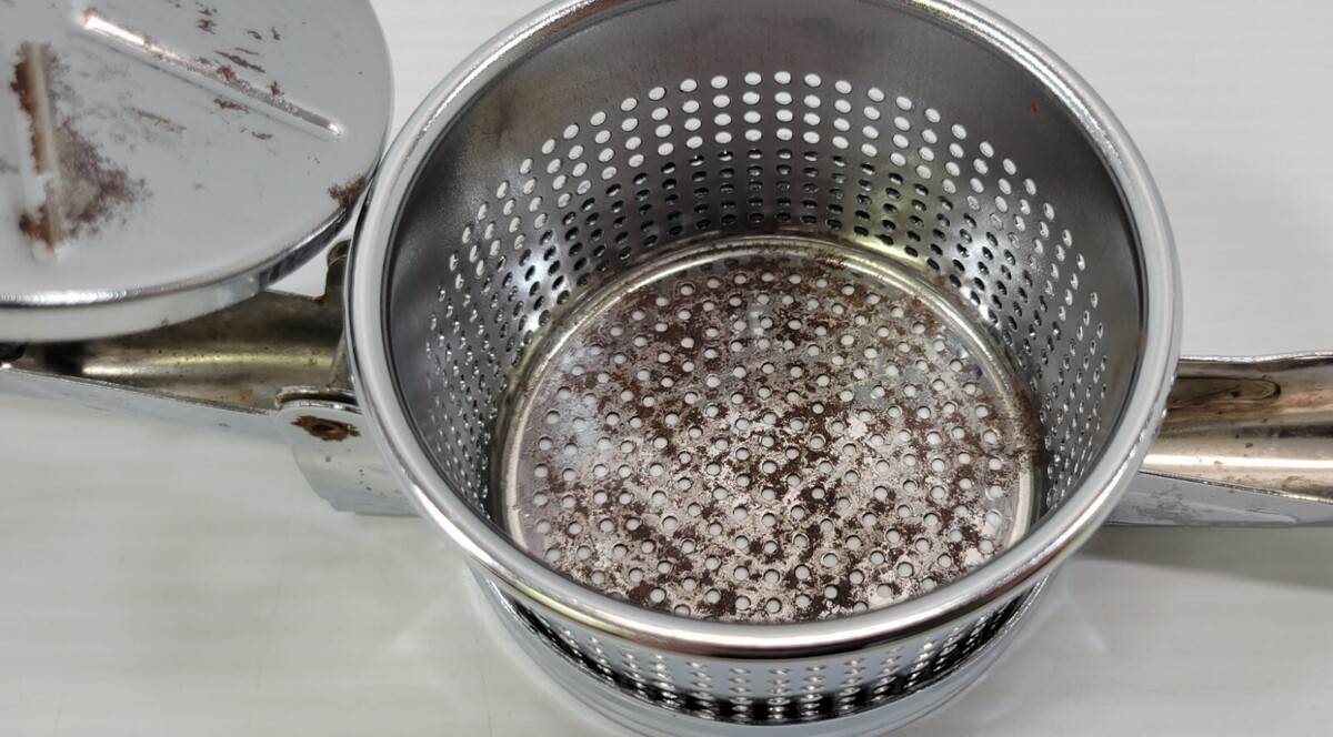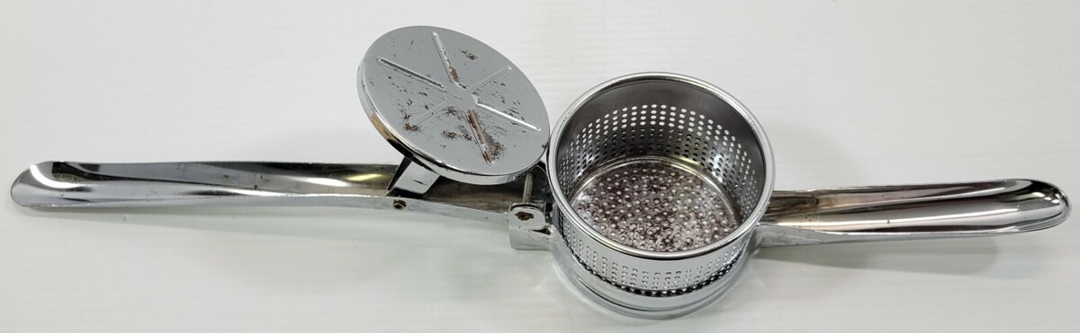 Masher developed some rust spots while being stored at summer home. It could potentially be restored or be re-purposed for arts/craft projects.
