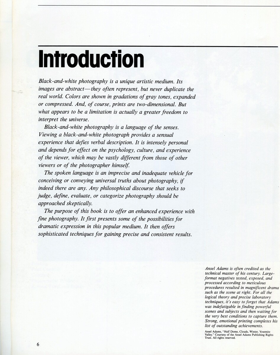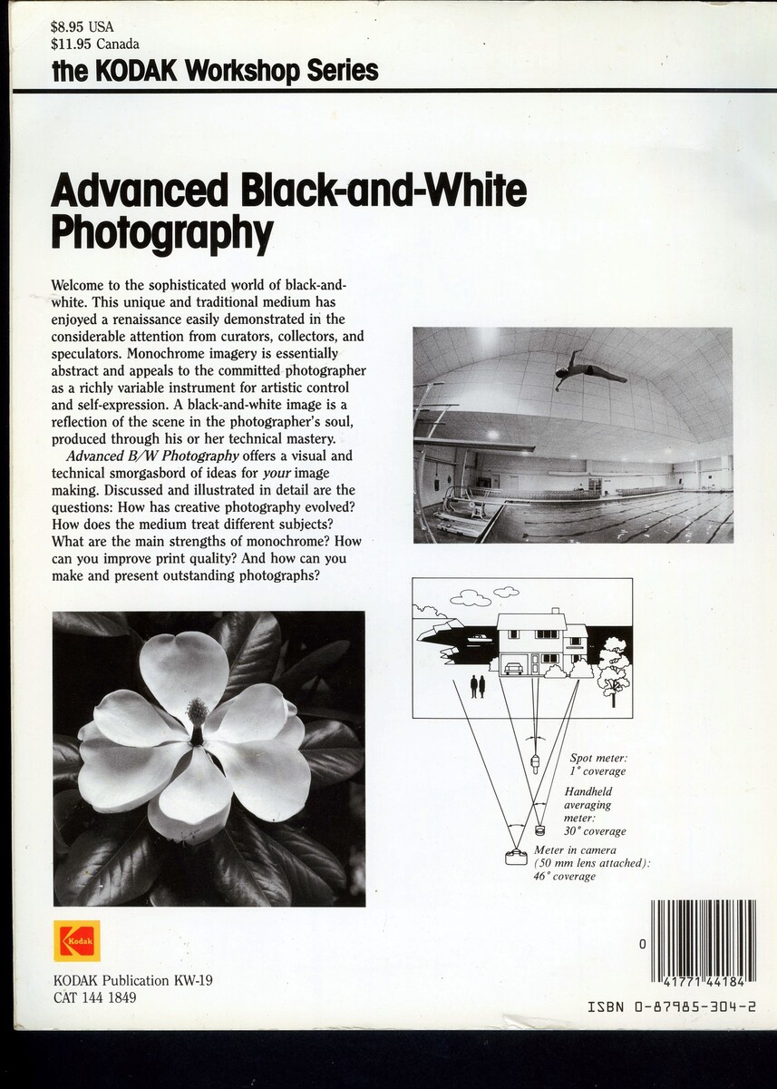 This is a book on advanced black white film photography. Please read the contents page for a list of subjects covered in this book. It was published in 1985 and measures 8 1/2" x 11" with 96 pages of detailed instructions on b w photography. The book is in good condition. There is no handwriting on any of the pages. The book does show minor wear from use, and there are a few pages that were dog-eared. English.