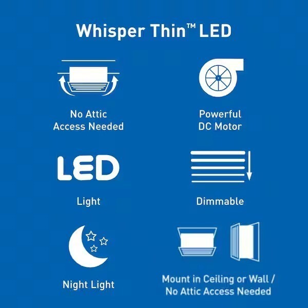 The WhisperThin DC exhaust fan with LED lighting and customizable Pick-A-Flow Speed Selector offers flexibility with an 80 or 100 CFM airflow. Set the switch in the fan box to choose your CFM ensuring optimum performance. In addition to bathrooms, it is your ventilation solution for medium-to-large sized rooms: laundry room, sunroom, basement or garage.