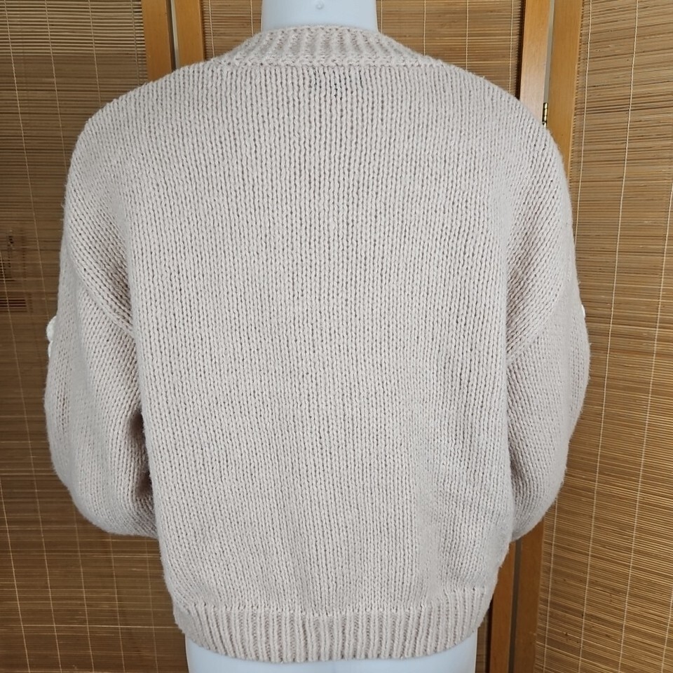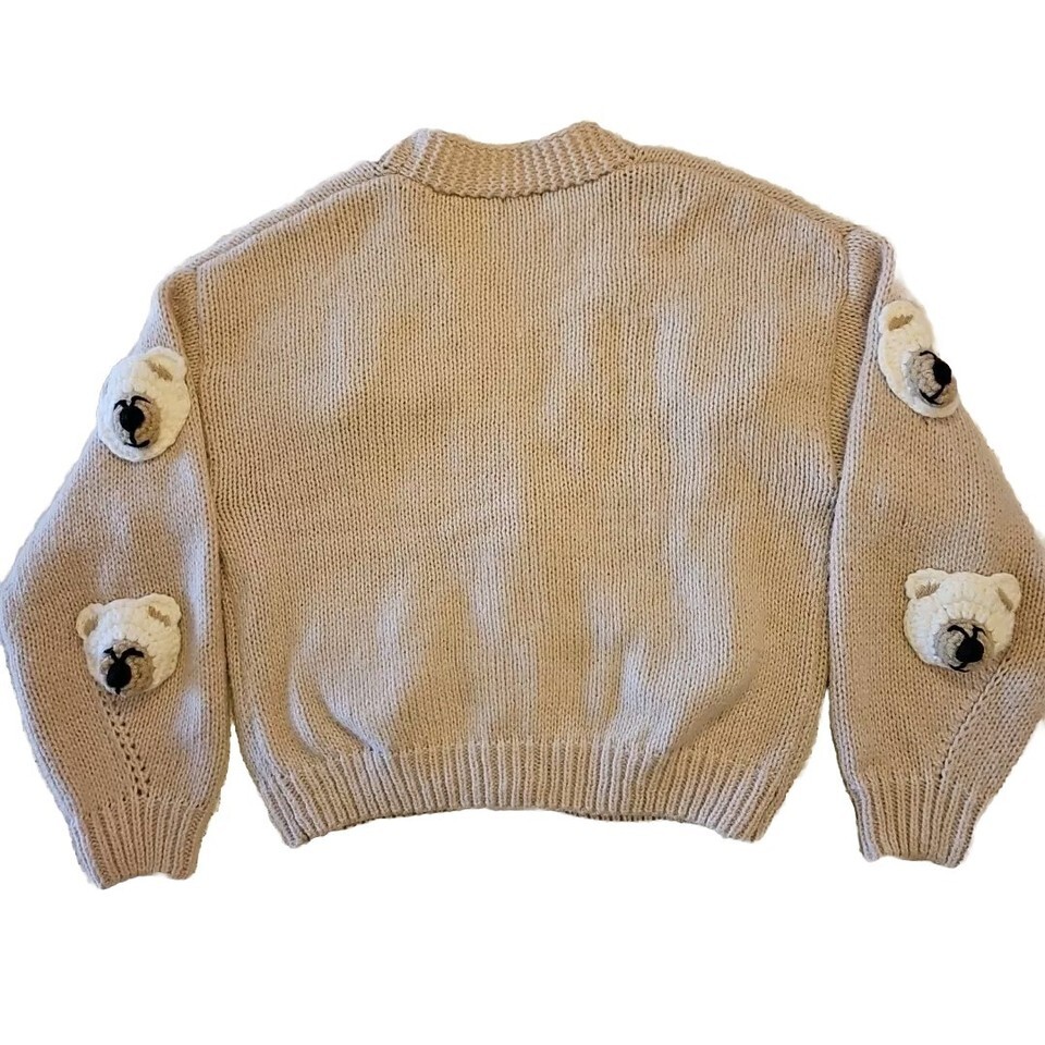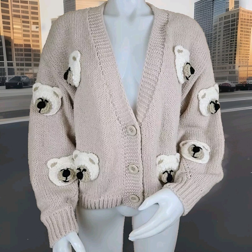 Debut Cropped Sweater 3D Bear Chunky Crochet Beige Polyester Cardigan