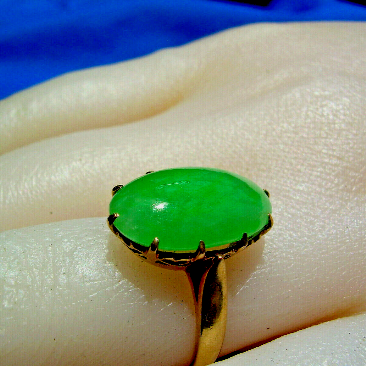 ANTIQUE IMPERIAL GREEN COLOR JADEITE JADE 18K SOLITAIRE.