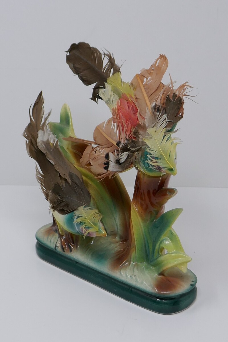 This figurine from Japan showcases beautifully crafted porcelain birds with intricate details and real feathers, making it a unique and charming addition to any collection. Measuring approx. 6.5" tall and 6" wide, these have minimal wear. The figurine captures the essence of vintage design with its mid-century aesthetic, while the porcelain material and Japanese craftsmanship add an elegant touch to any decor. Perfect for bird lovers and collectors alike, this figurine is a timeless piece that adds a touch of nature and nostalgia to any space.
