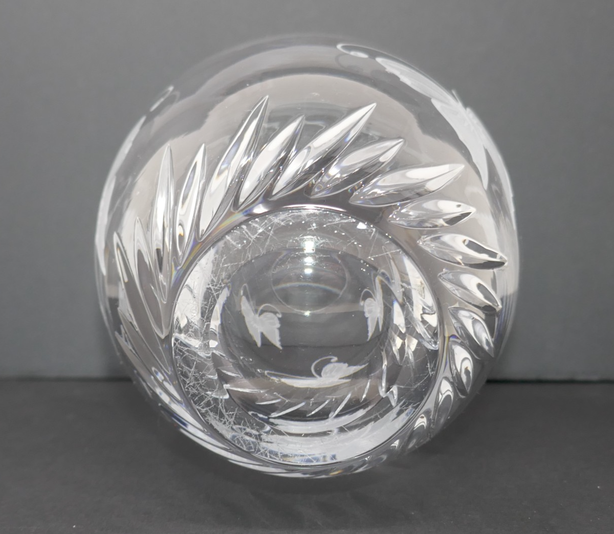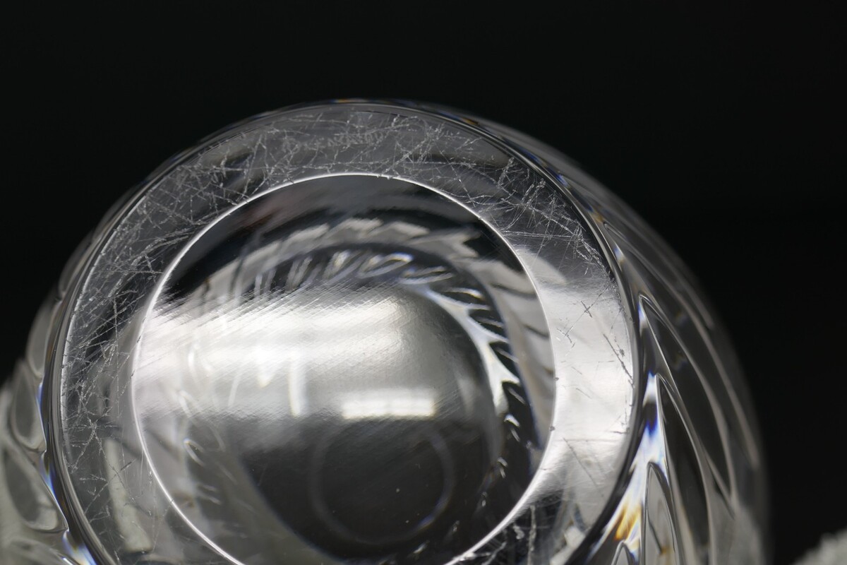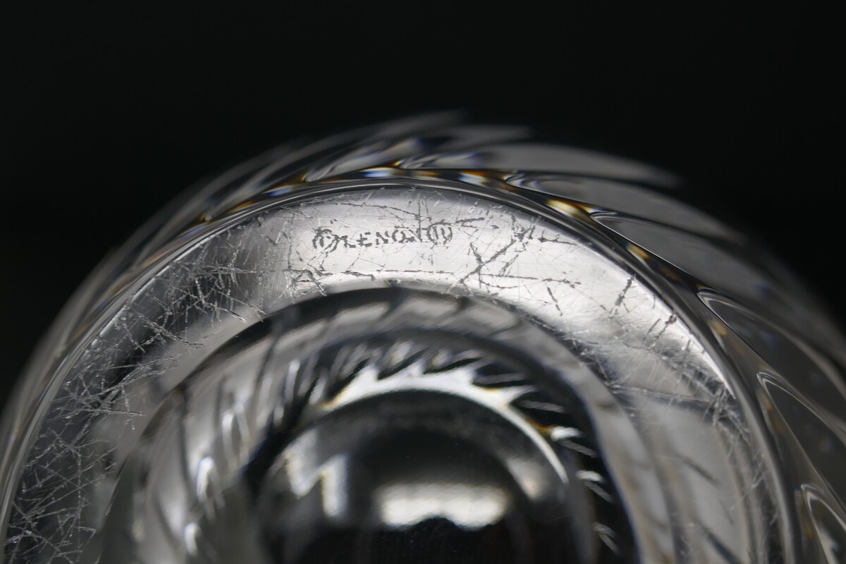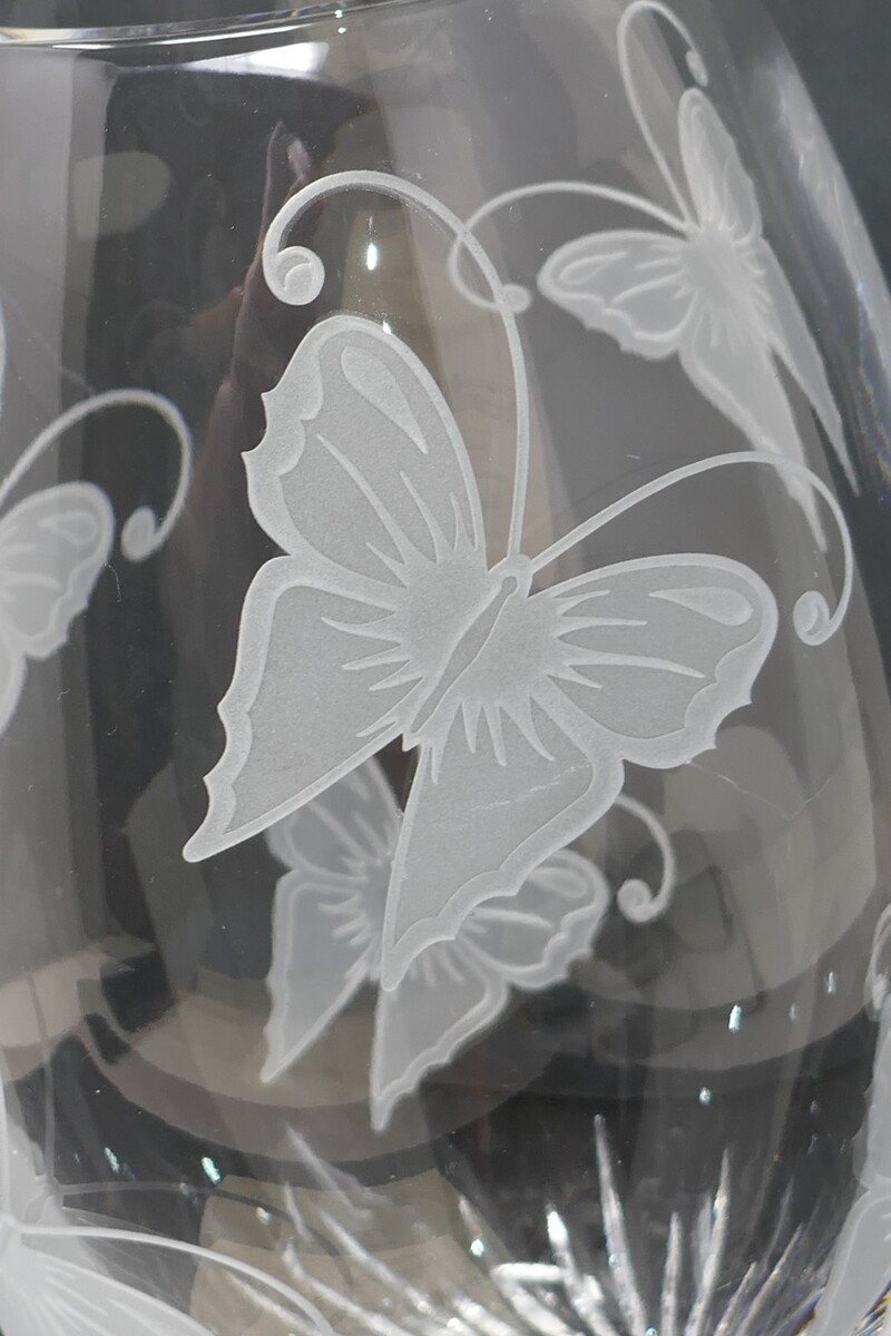 The Lenox Crystal Butterfly Vase is a stunning piece of decorative collectible. It features a round shape with an etched butterfly pattern on clear crystal glass. The contemporary style and wildlife theme make it a beautiful addition to any adult's department or unit. Easy to clean with warm water, this original piece stands at 9 inches tall and 4.5 inches wide, adding a touch of elegance to any space. The side has a scratch as does the bottom.