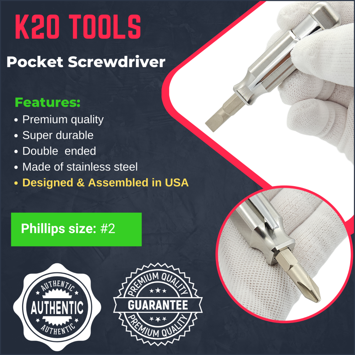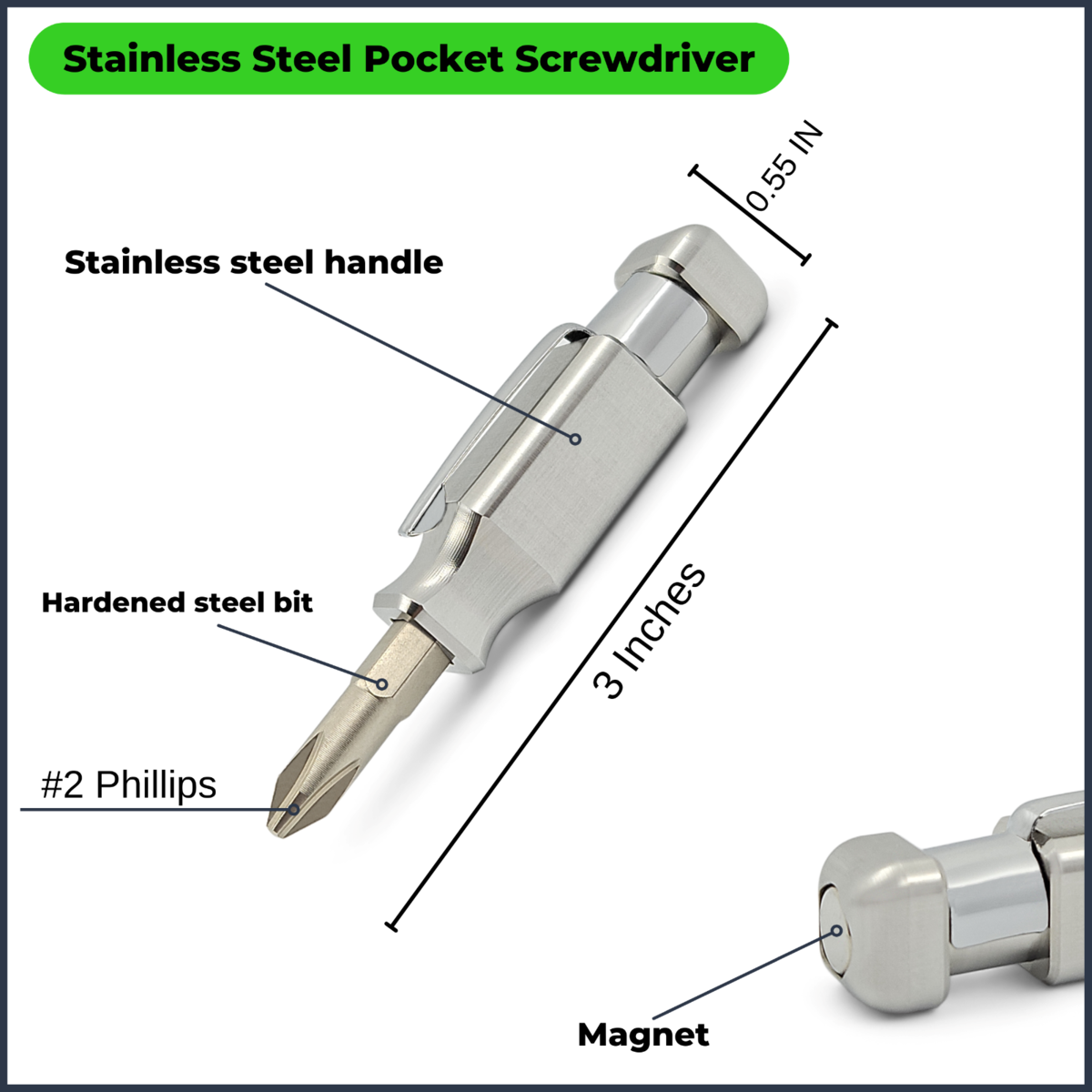 Pocket Screwdriver with Magnet and Clip Phillips and Flat Head - Stainless Steel