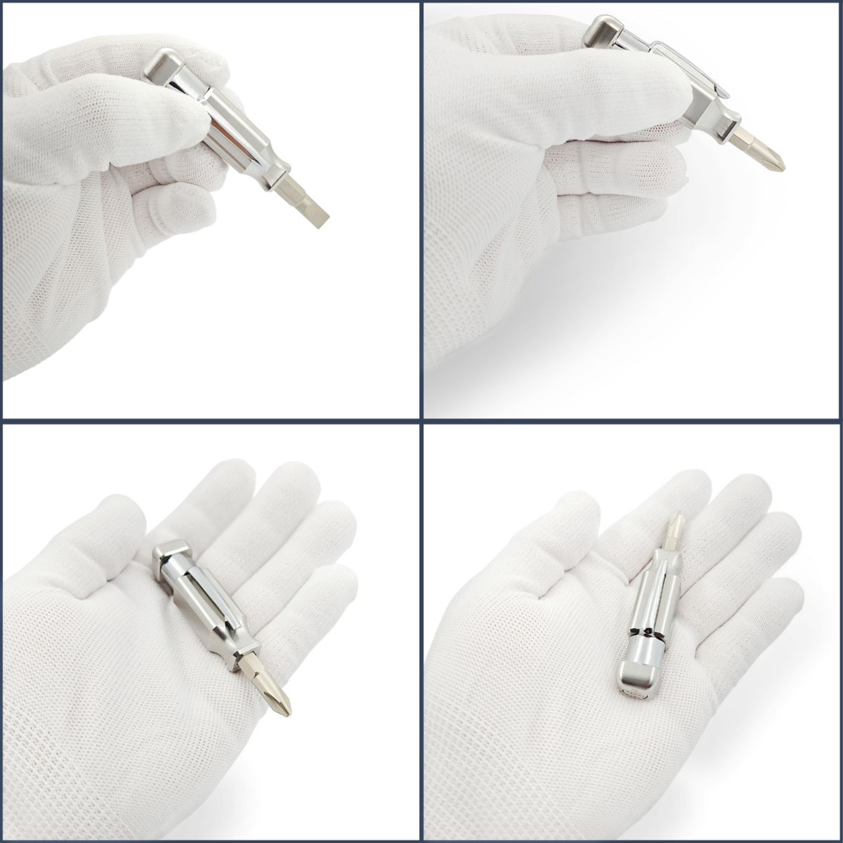 A small portable tool designed for quick and easy tightening or loosening of screws. Handle is made of metal and the bit is double ended with Phillips and flat head. A perfect addition to the home or workshop. This is a small and super compact tool-Making them ideal for pockets and small drawers.