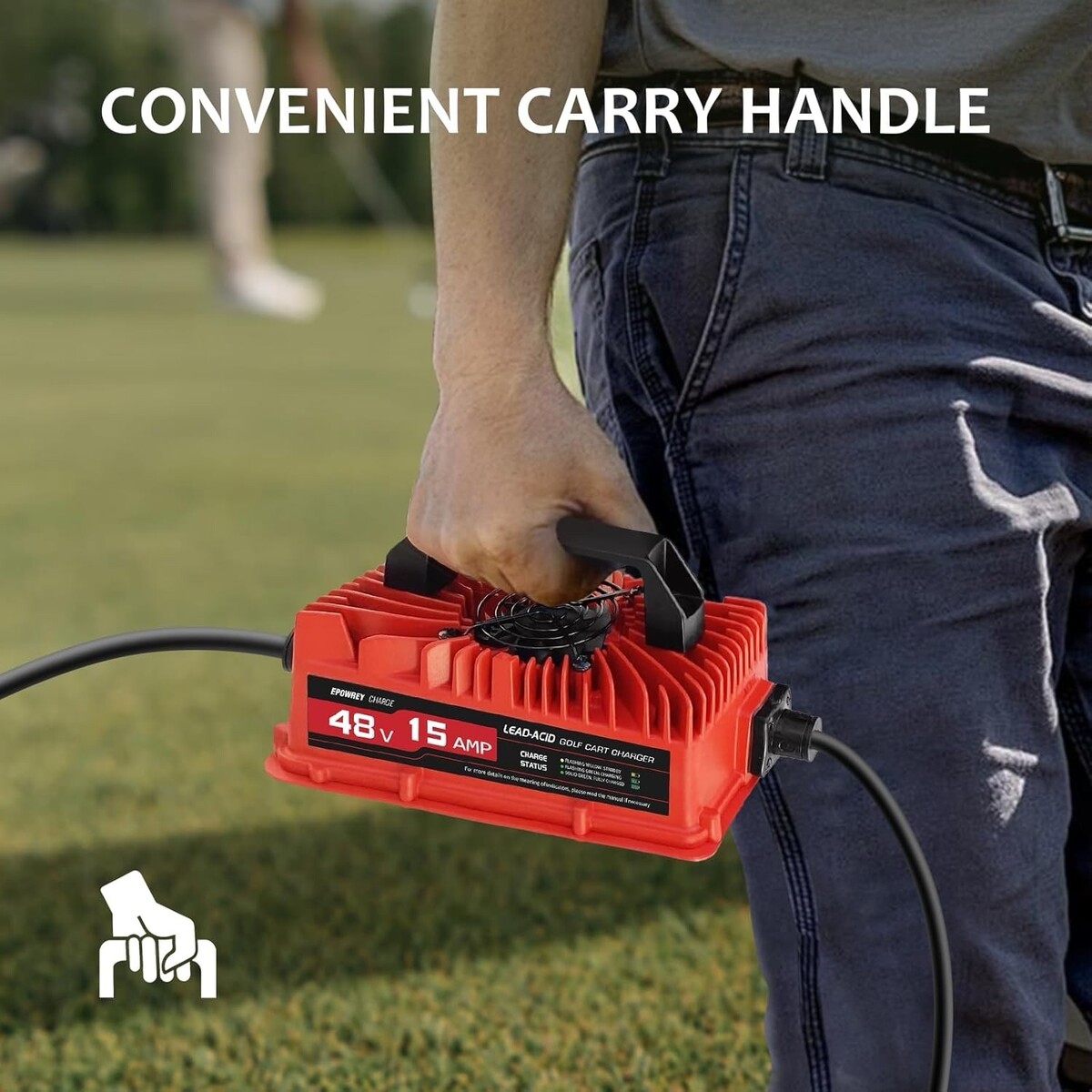 High-output Epowrey 48V 15-Amp Golf Cart Charger, compatible with EZGO TXT carts using the standard D-style 3-pin plug.