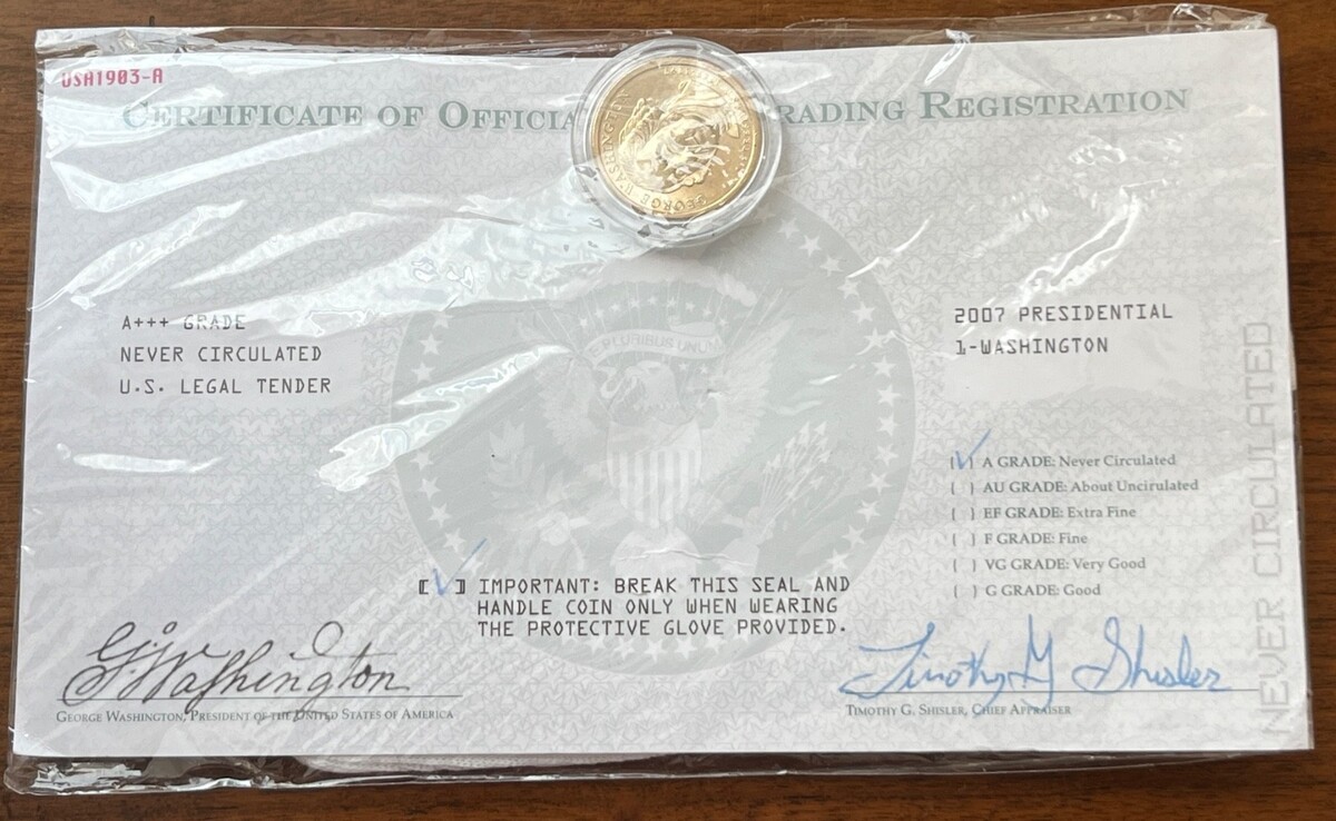 2007 George Washington Presidential $1 Dollar Coin w/ Certificate A Grade Sealed