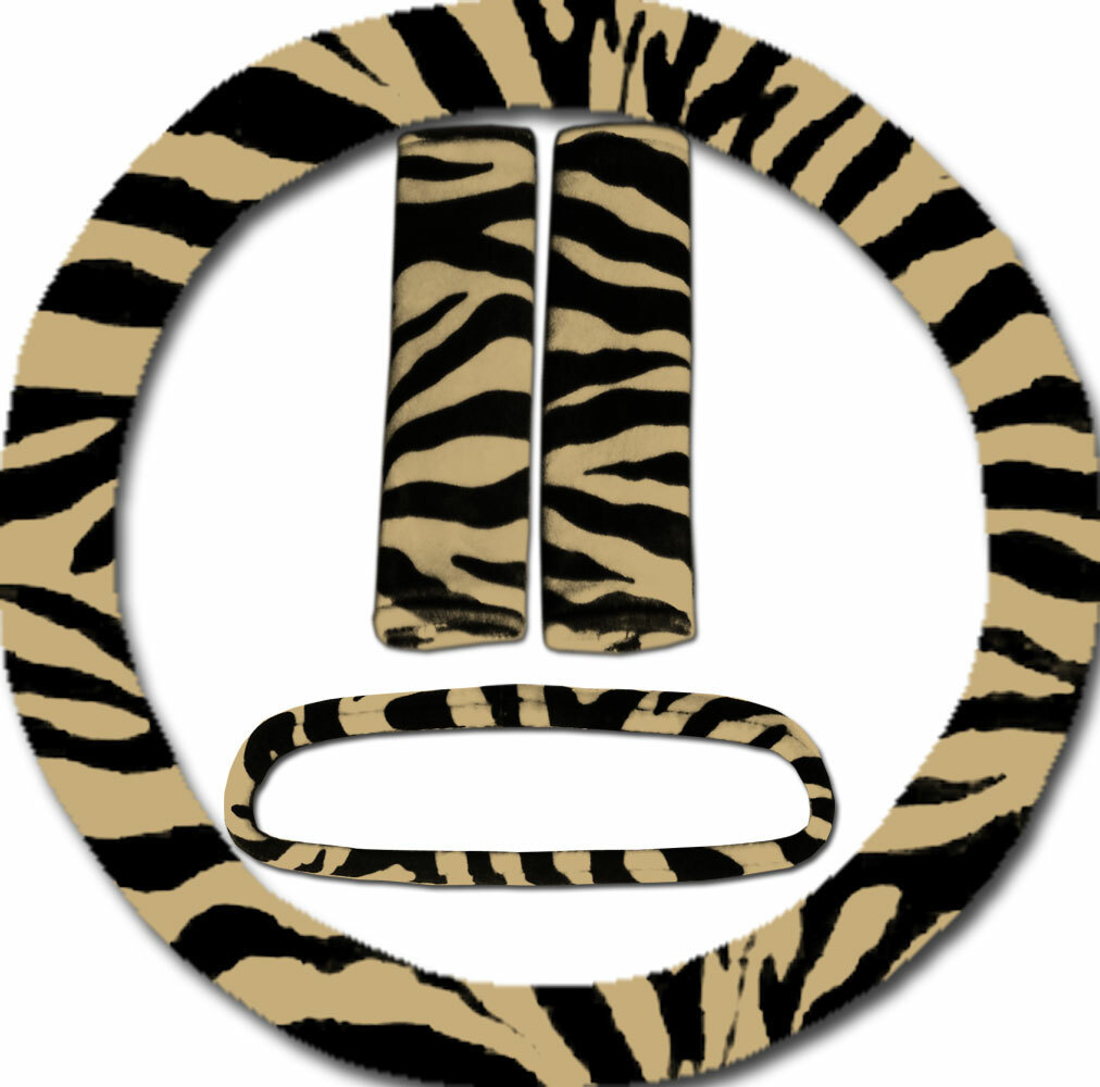 Steering wheel cover, seat belt covers & rear view mirror cover Tan Zebra