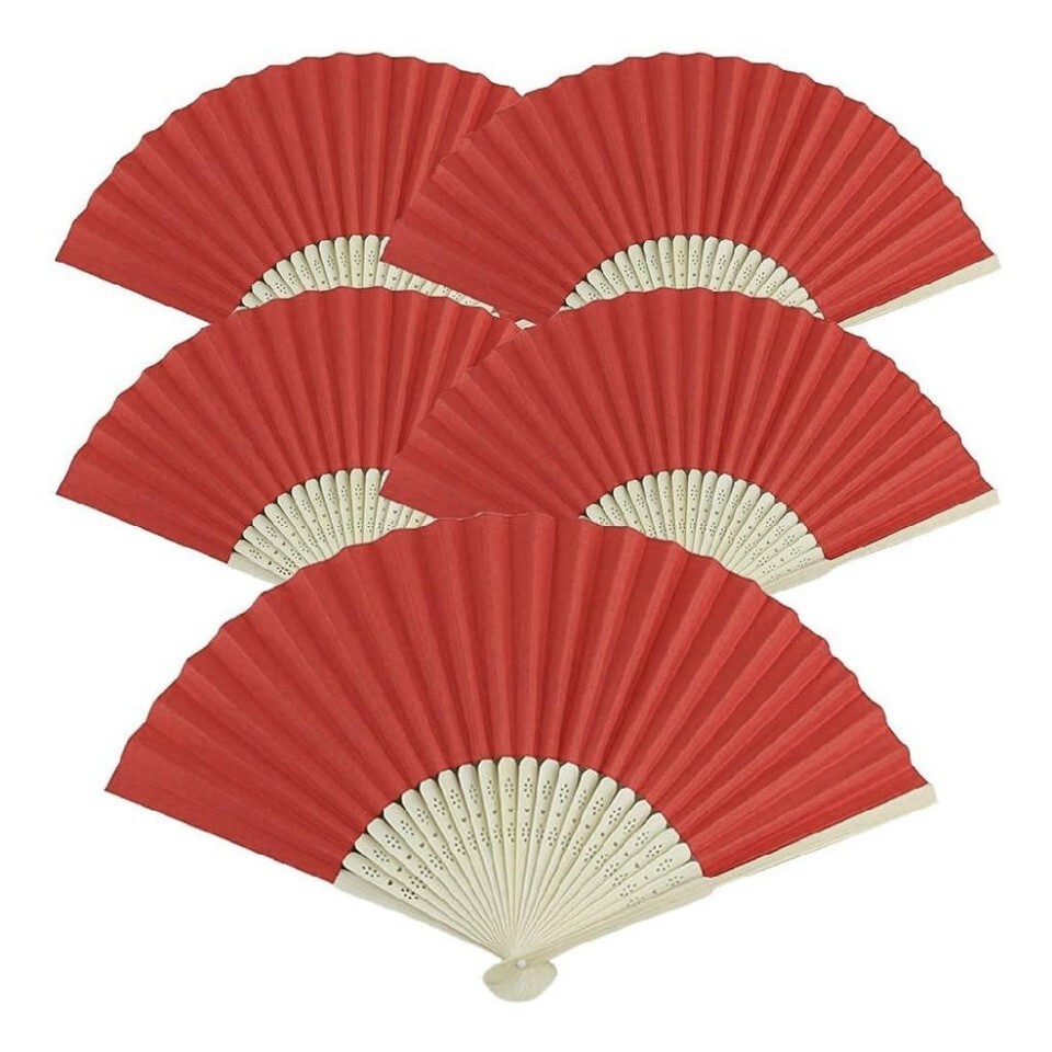 5pcs Red Paper Fans Lot of 5 Five Folding Hand Fan Pocket Purse Wedding Bamboo