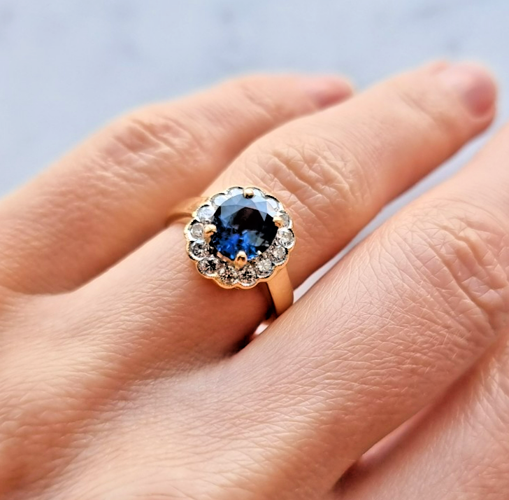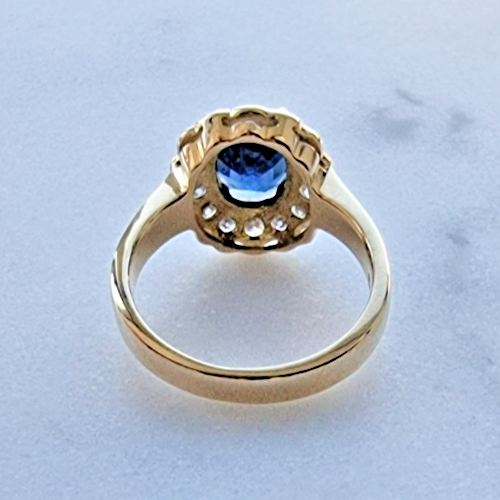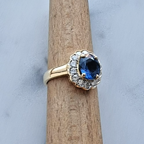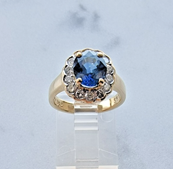 6 gram , appraised at 4700.00. appraisal included This vintage 18K yellow gold ring features a stunning 1.95 ct oval sapphire as the main stone, surrounded by 13 natural diamonds totaling 0.52 ct. The ring is perfect for an engagement occasion, with a beautiful blue main stone color and a yellow gold metal. The cocktail style ring is set with prongs and has a band width of 2.8mm, making it a stunning and unique piece of fine jewelry.
