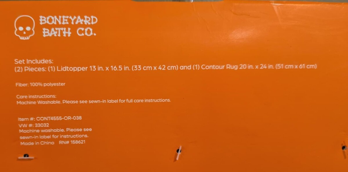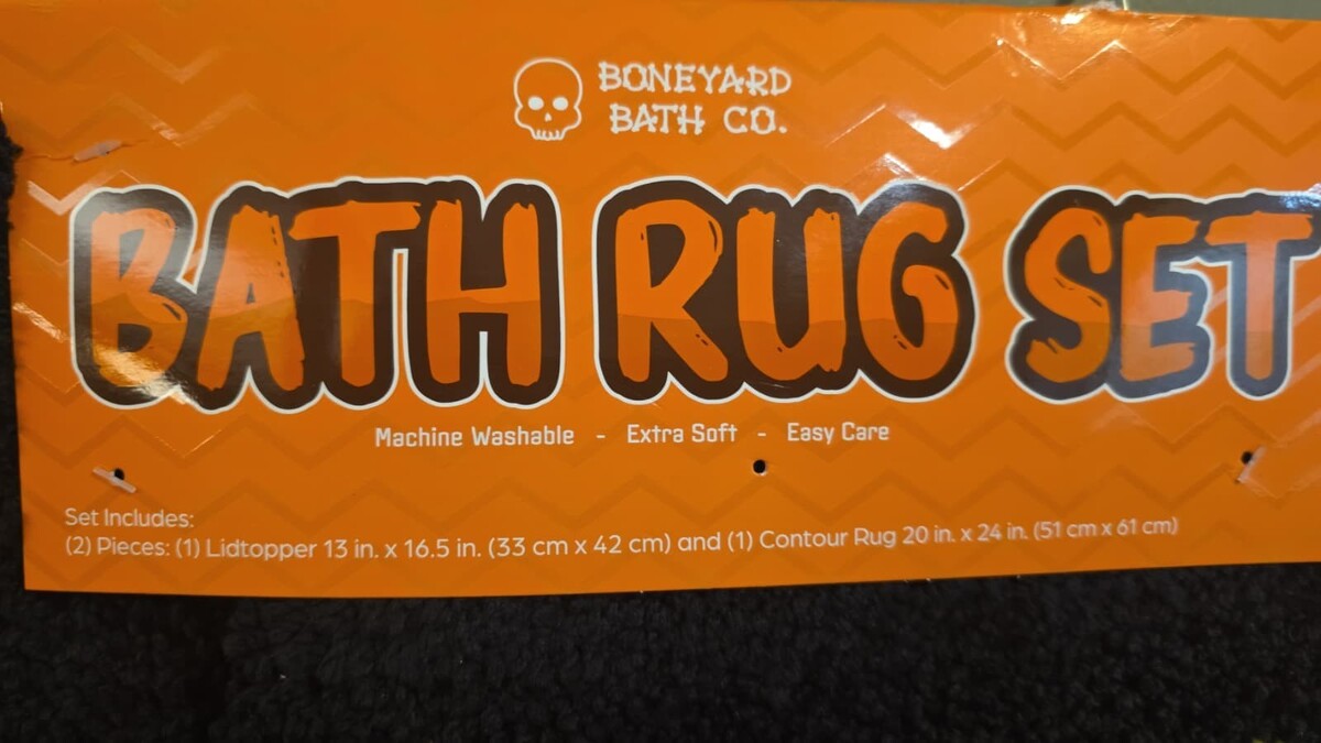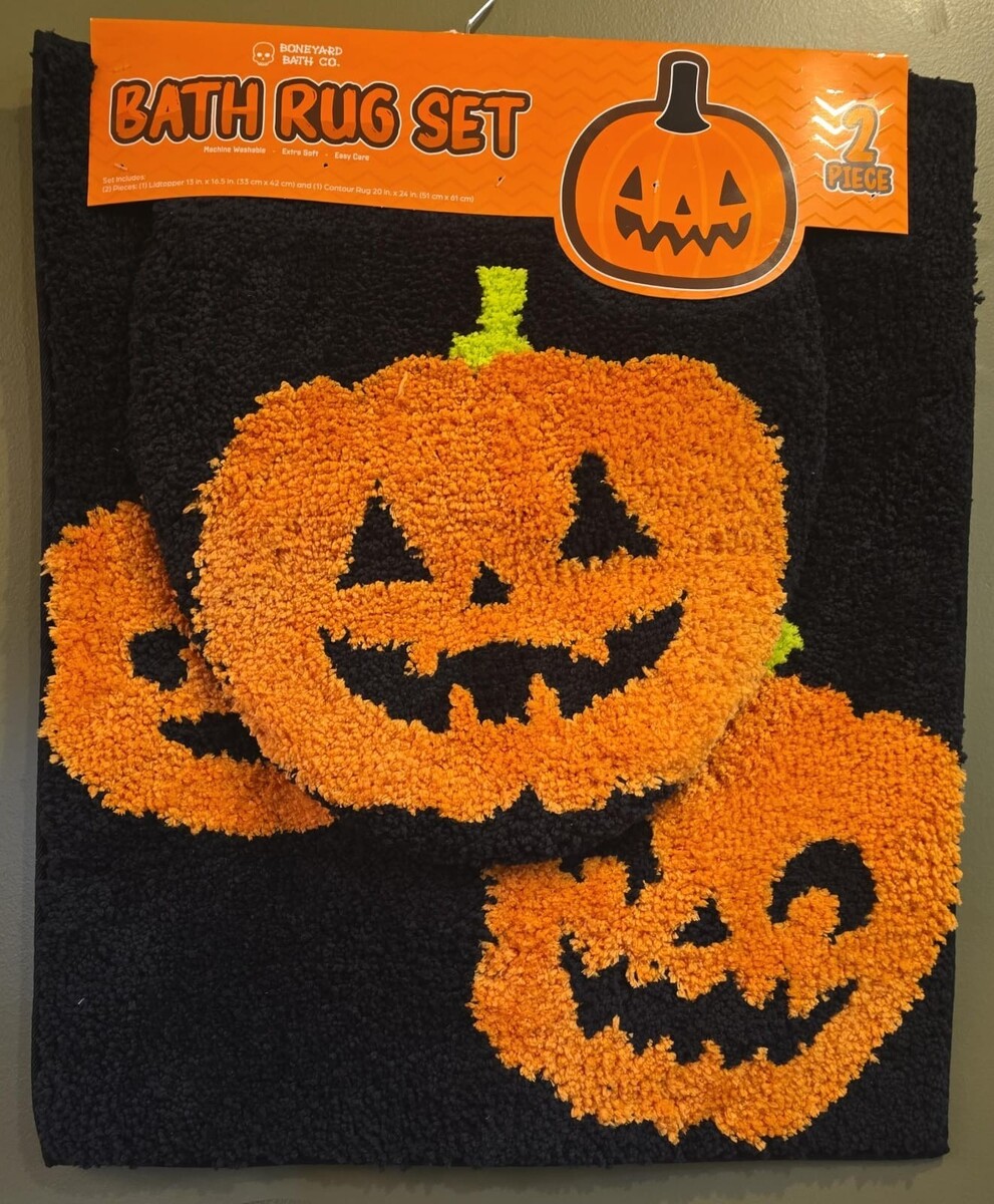 Boneyard Bath Co. Halloween bath rug set featuring a jack-o'-lantern design.