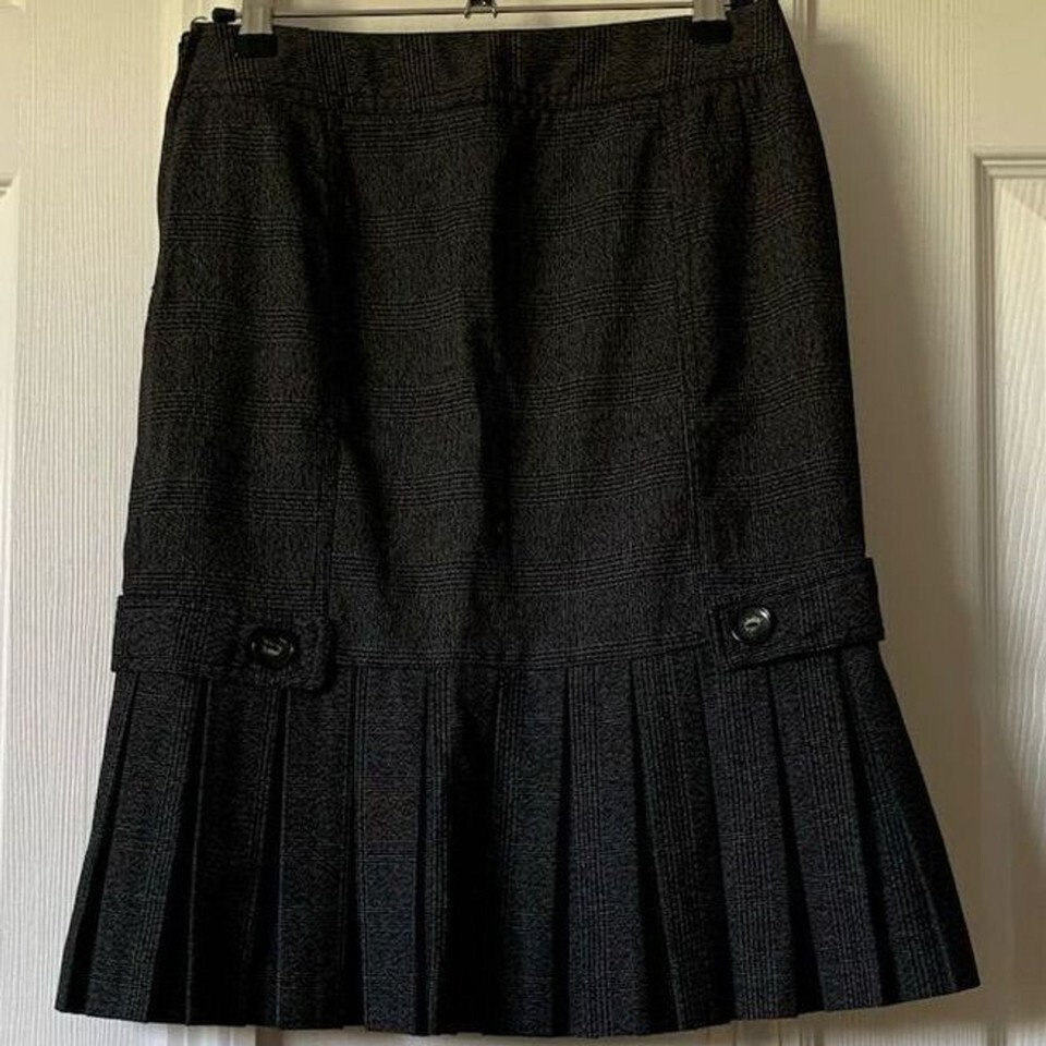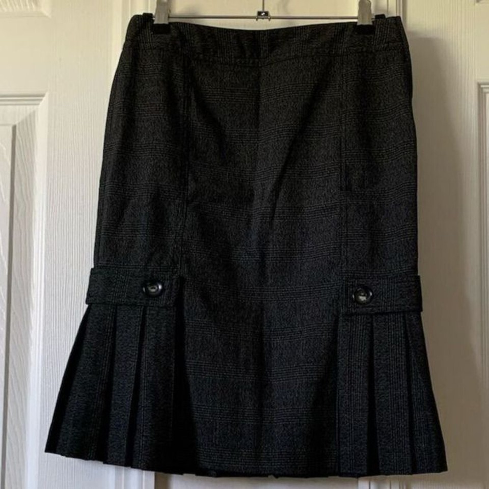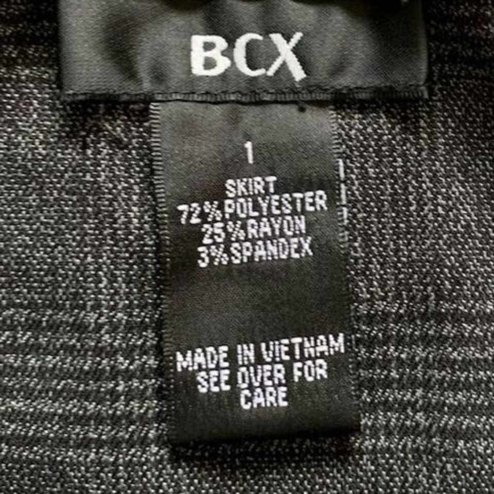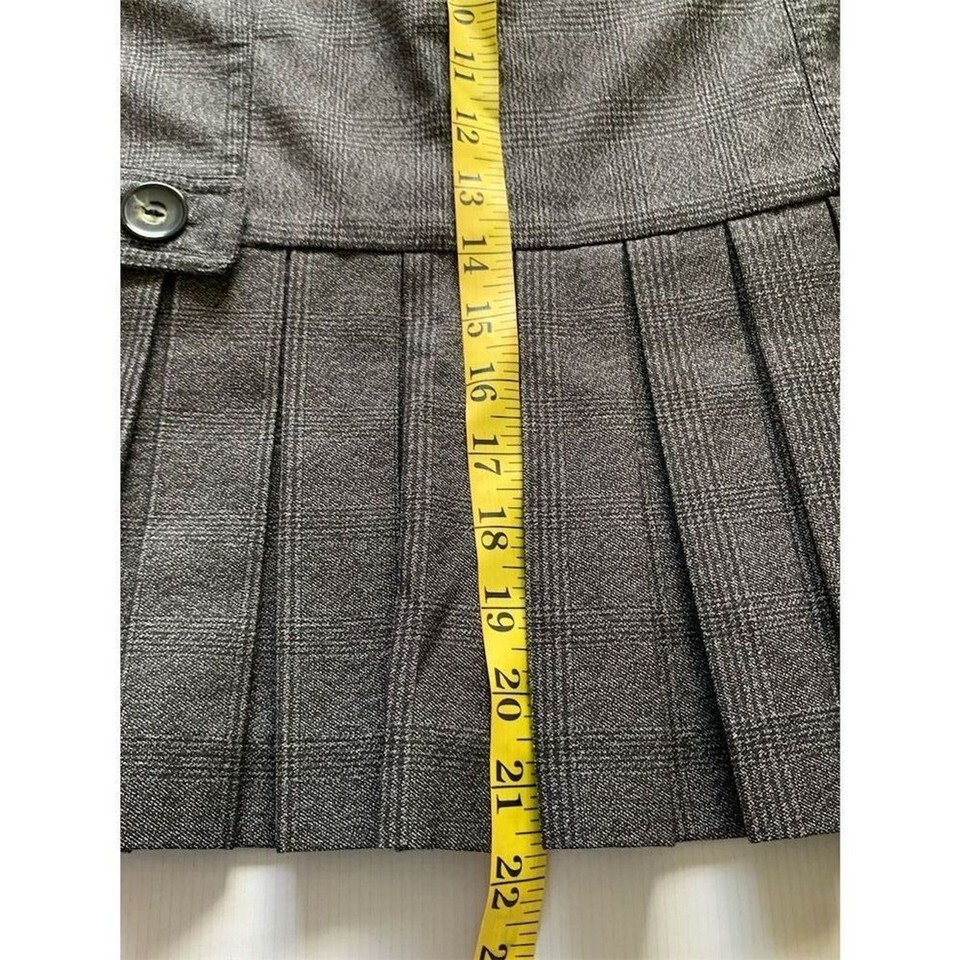 Keywords: BCX, pleated skirt, plaid, gray skirt, women's fashion, casual wear, short skirt, button accents, stretch fabric, machine washable, pre-owned skirt, all seasons, knit fabric, polyester blend, regular size.