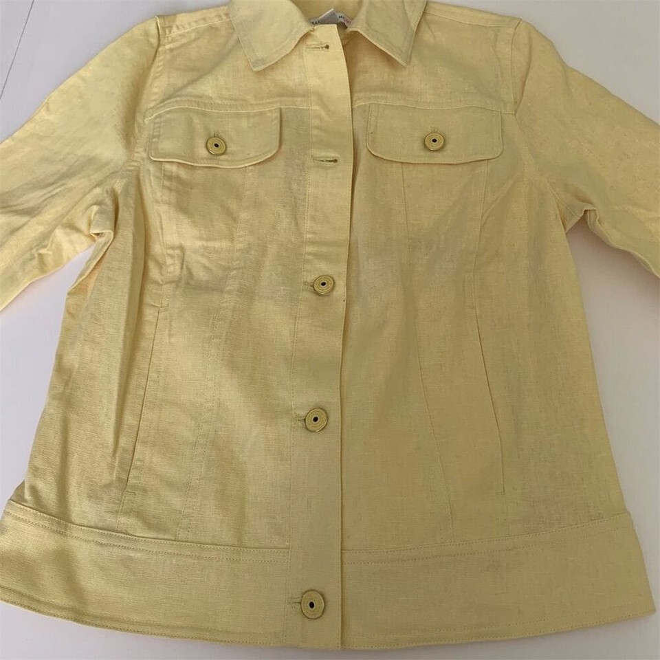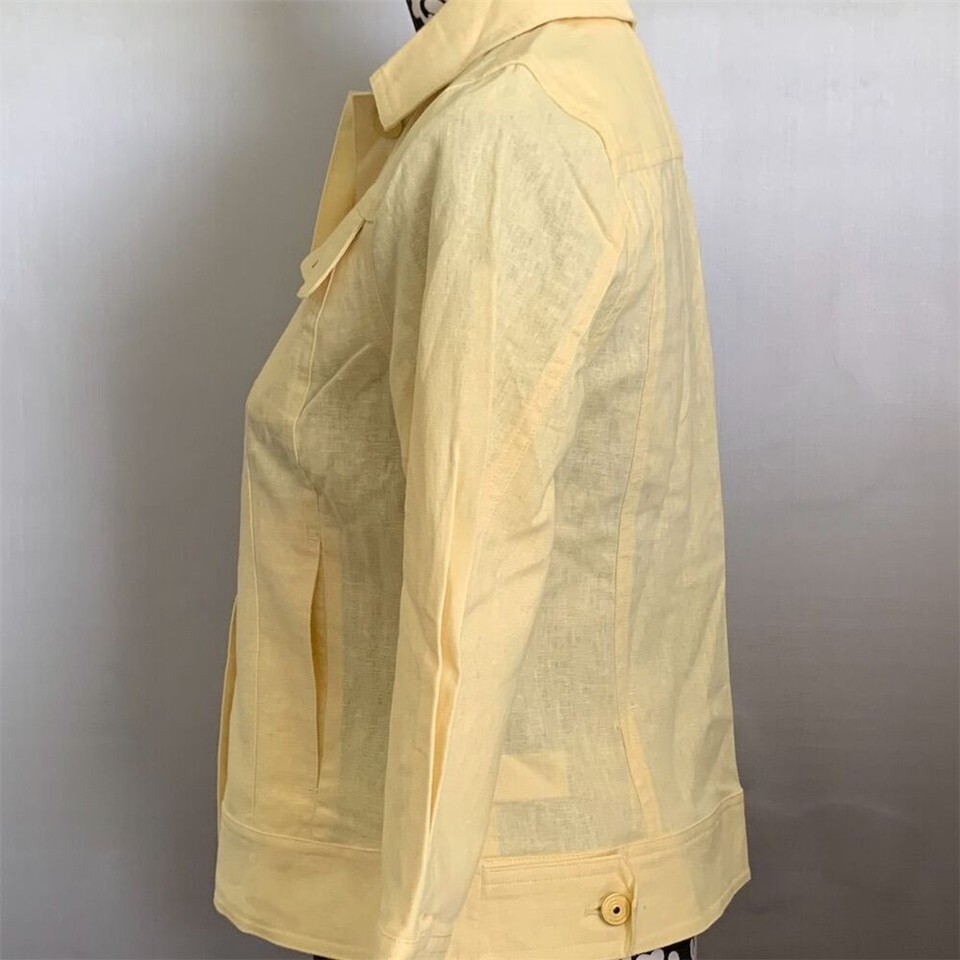 The Isaac Mizrahi Live! Women's Basic Jacket in size 2 features a 55% linen and 45% cotton outer shell. This yellow jacket has a collared neckline, 3/4 sleeves, and buttoned chest pockets. It is suitable for casual and travel occasions during fall, spring, and summer. The jacket is new. Keywords: Isaac Mizrahi, women's jacket, linen jacket, cotton jacket, yellow jacket, casual jacket, travel jacket, 3/4 sleeve jacket, collared jacket, buttoned jacket, spring jacket, summer jacket, fall jacket, size 2 jacket, basic jacket.