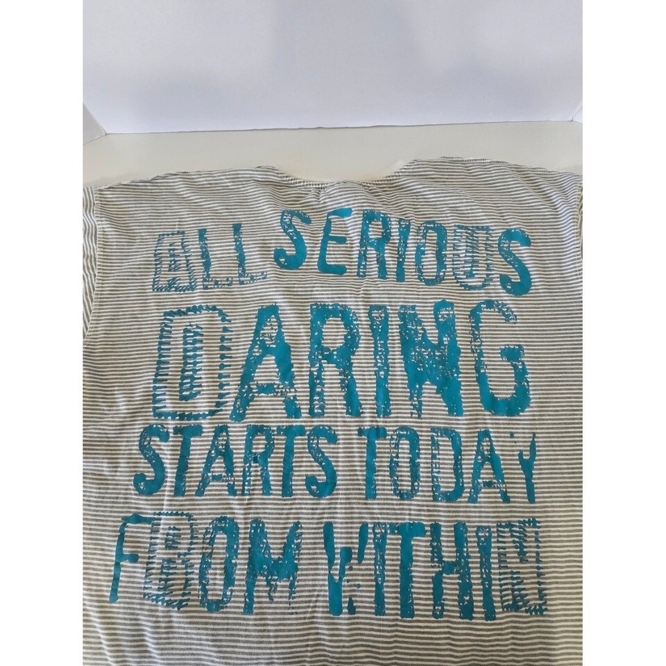 Make a bold statement with this striking Black Label t-shirt, designed for those who embrace their unique style. The classic gray and white pinstripe canvas is dramatically punctuated by a powerful graphic of crossed tattoo-covered fists, exuding an edgy vibe. Embrace the rebellious spirit with the impactful message emblazoned on the back, "All Serious Daring Starts Today From Within," a constant reminder of inner strength and motivation. The distressed black accents on the sleeves add a touch of raw, authentic character, perfect for those who appreciate distinctive detailing. This tee is an ideal choice for a casual day out, a concert, or a laid-back gathering with friends.