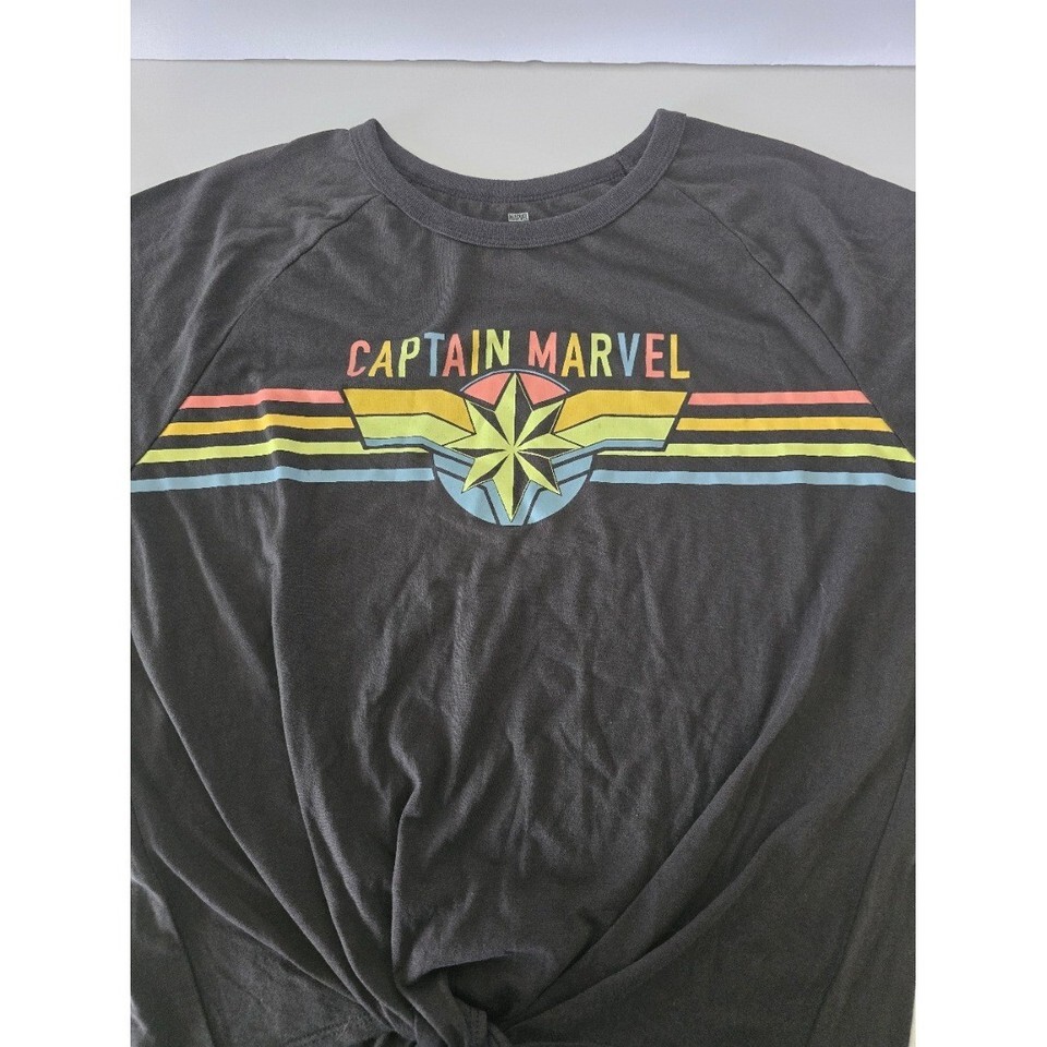 Keywords: Captain Marvel T Shirt, Marvel Comics Tee, Women's Graphic T Shirt, Tie Front Shirt, Rainbow Stripe Shirt, Superhero Apparel, Casual Top, Short Sleeve T Shirt, Licensed Merchandise, Marvel Fan Gift, Cosmic Style, Comfy T Shirt, Feminine Fit