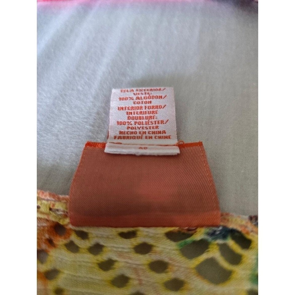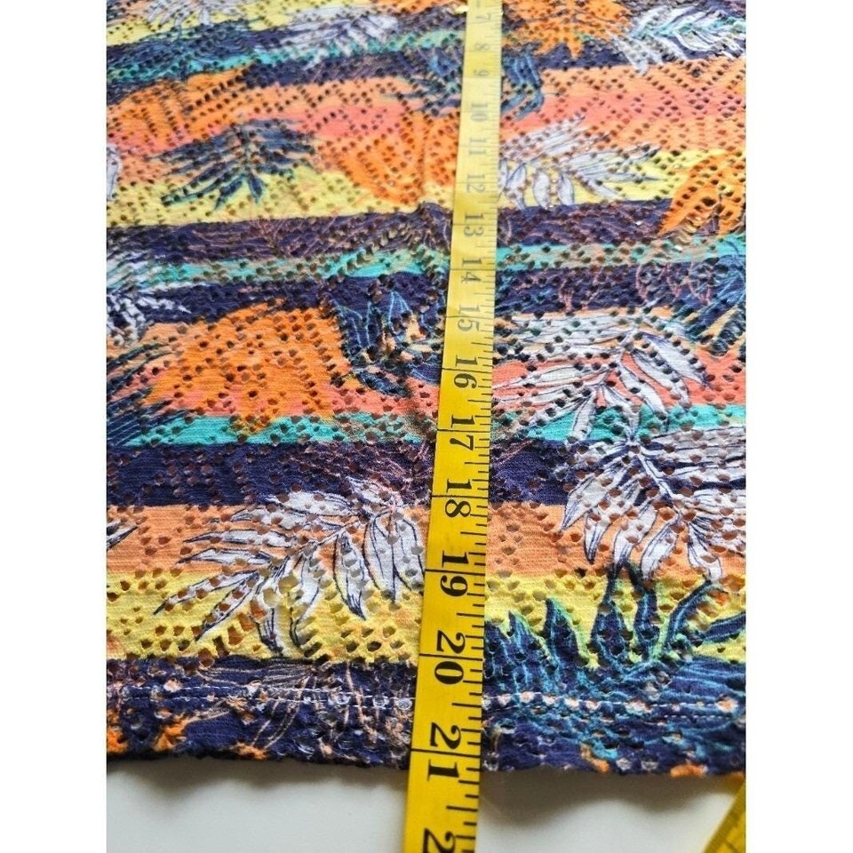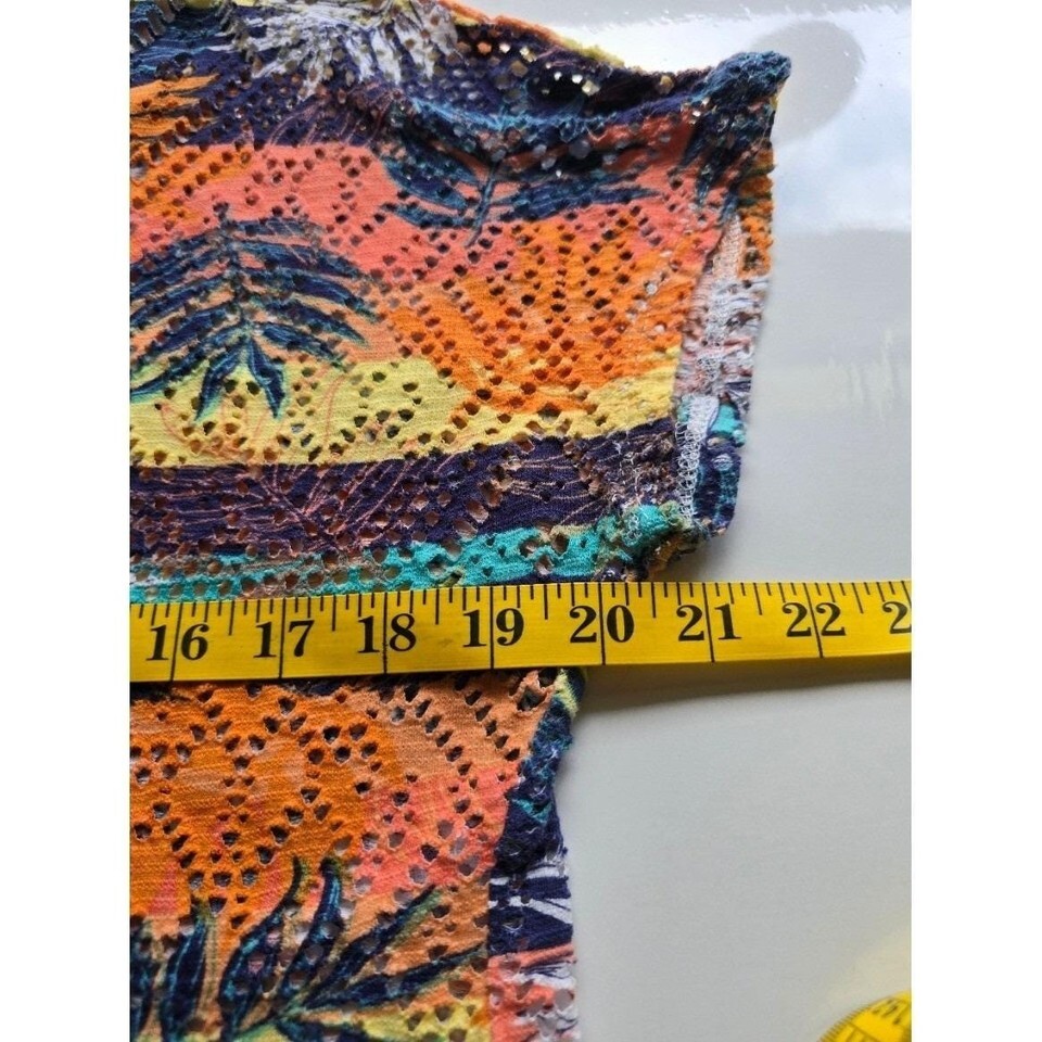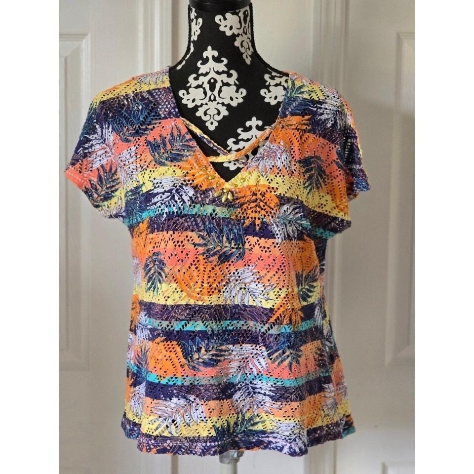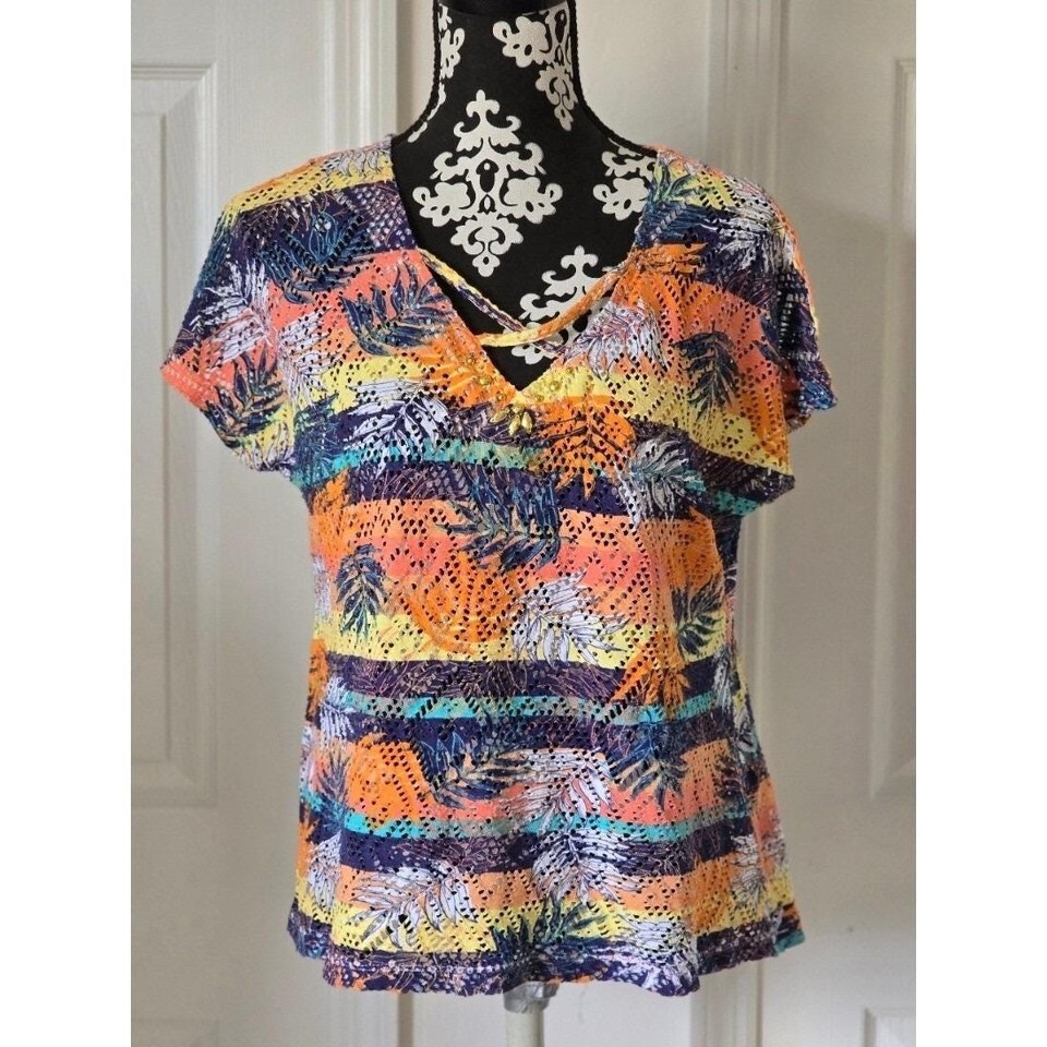 Hearts of Palm Tropical Palm Leaf Print Crochet Knit V Neck Top Womens Large