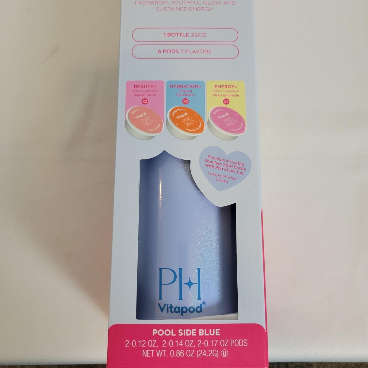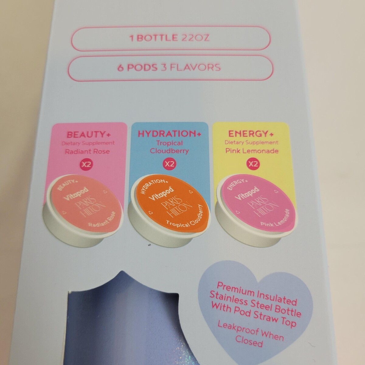 Paris Hilton x Vitapod 22oz Pearlescent Water Bottle 6 Drink Mix Pod Poolside Blue