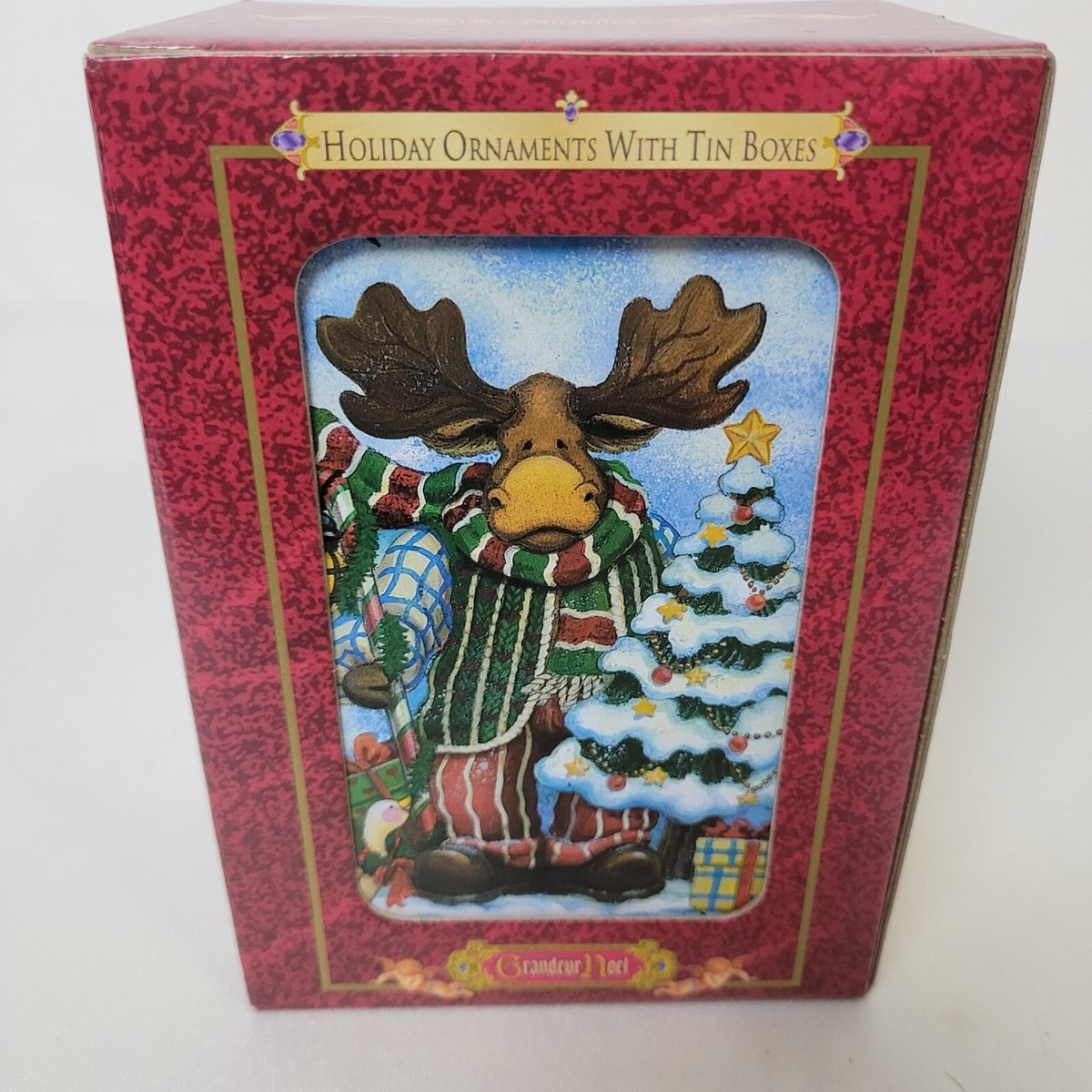 Grandeur Noel Holiday Christmas Ornament Tin Gift Box Angel Moose Christmas Tree